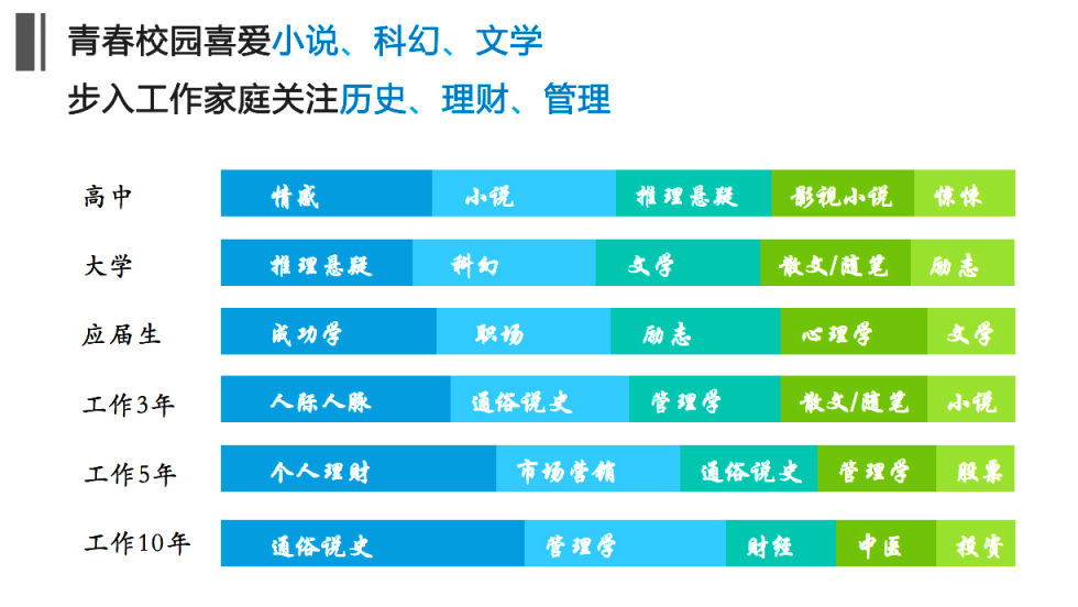 在阅读内容方面,各个阶段读者群有鲜明的特点:高中生关注感情更多;大学生爱好广泛,关注悬疑、励志、科幻、文学散文等内容;应届生特别关注成功学和职场书籍;工作三年的读者开始关注人际人脉、通俗说史类书籍;工作五年后的读者开始关注个人理财;工作10年后的读者把中医养生放到了书架上。