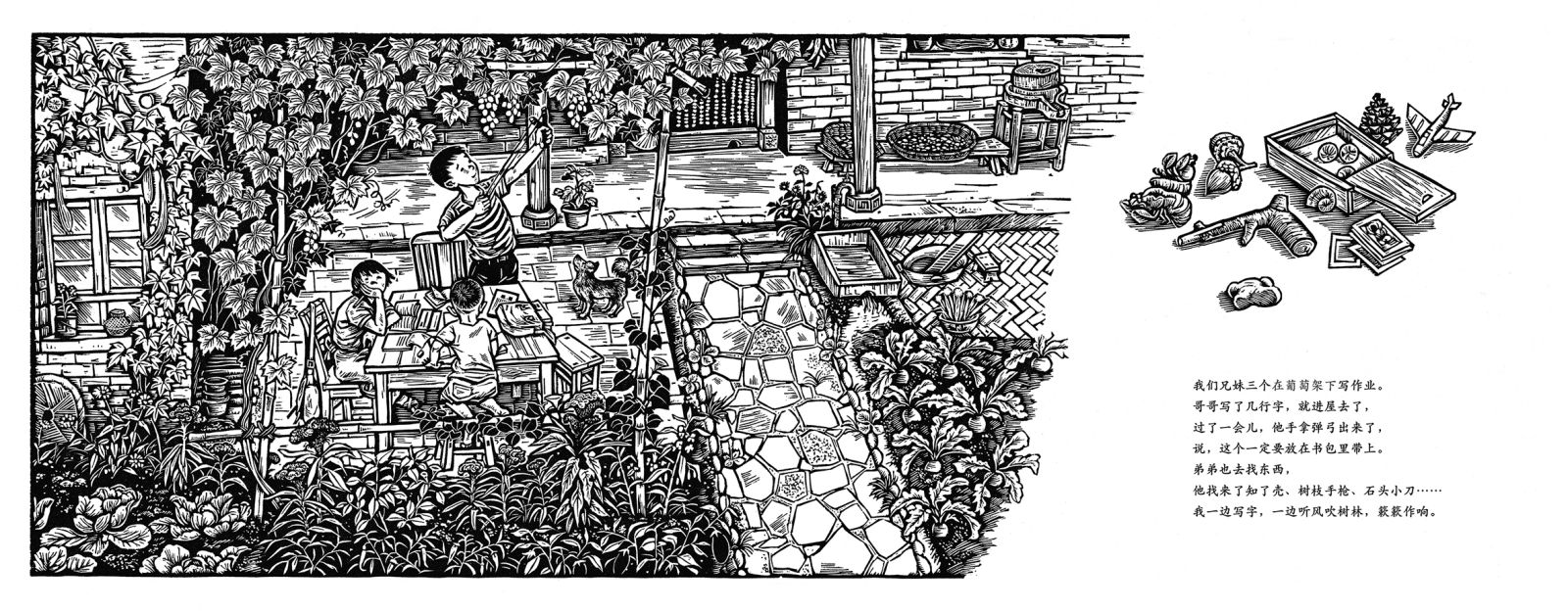 他也确实在图画中悄悄藏进了自己的童年。画上的小女孩的衣服正是他姐姐儿时的打扮,画中三个孩子的家庭结构也与他家中大抵类似,院子里的布局是以姥姥家为原型……孩子们玩的玻璃球、羊骨板、小弟弟身上黑猫警长的背心,无不印刻着一代人的童年痕迹;一花一草一桌一椅,都凝聚着画家回望童年的眼光。他之所以愿意耗时五年一刀刀刻下这本《夏天的故事》,“也是在给自己遥远的童年一个交代”。