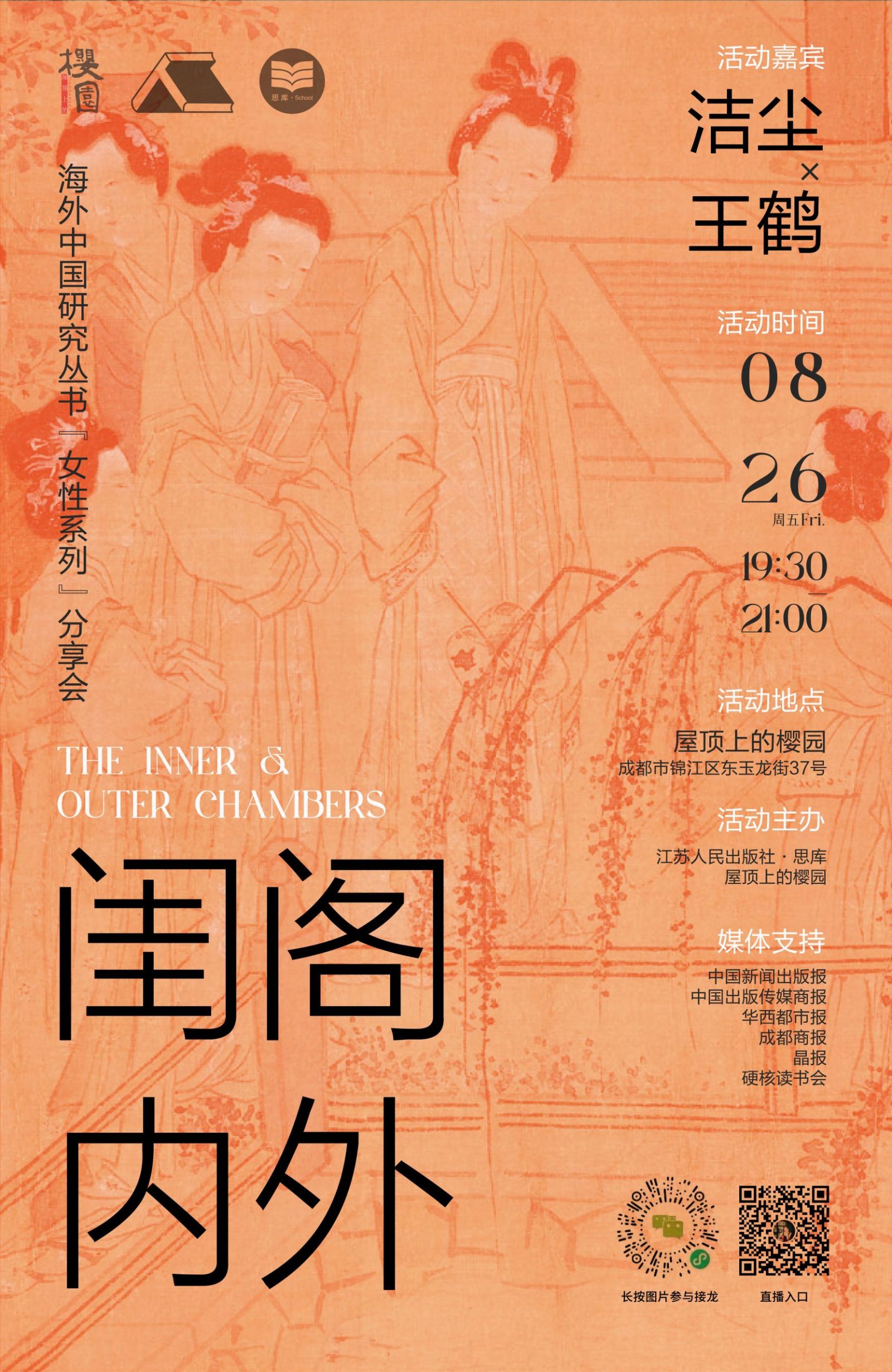 8月26日(周五)晚19:30,著名作家洁尘×王鹤将做客成都“屋顶上的樱园”,借由海外中国研究丛书“女性系列”6本书,与大家聊聊古代女性闺阁内外的生活。