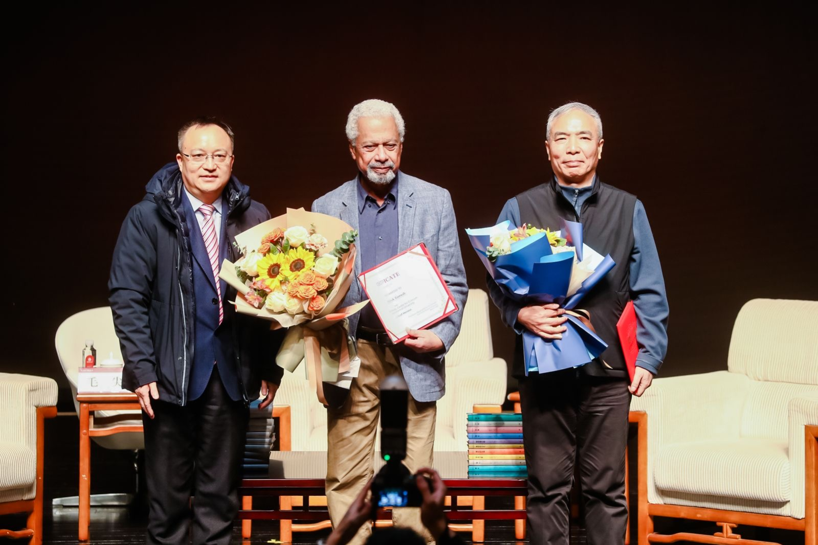 随后,古尔纳发表了公开演讲。演讲中,他通过中国人民耳熟能详的“郑和下西洋”故事,将其故乡桑给巴尔的历史与中国历史联系起来:“我从小到大都听说,我们曾与大洋彼岸的地方联系频繁。在海岸的一些地方沿沙滩行走,你会拾到青瓷碎片,它们产自中国,是郑和船队遗留下来的历史遗迹。”桑给巴尔的历史与他在动荡祖国中的童年经历也成为了他写作的动力。因此,他一直希望亲身感受灿烂迷人的东方文化,并对接下来在中国的行程充满期待。