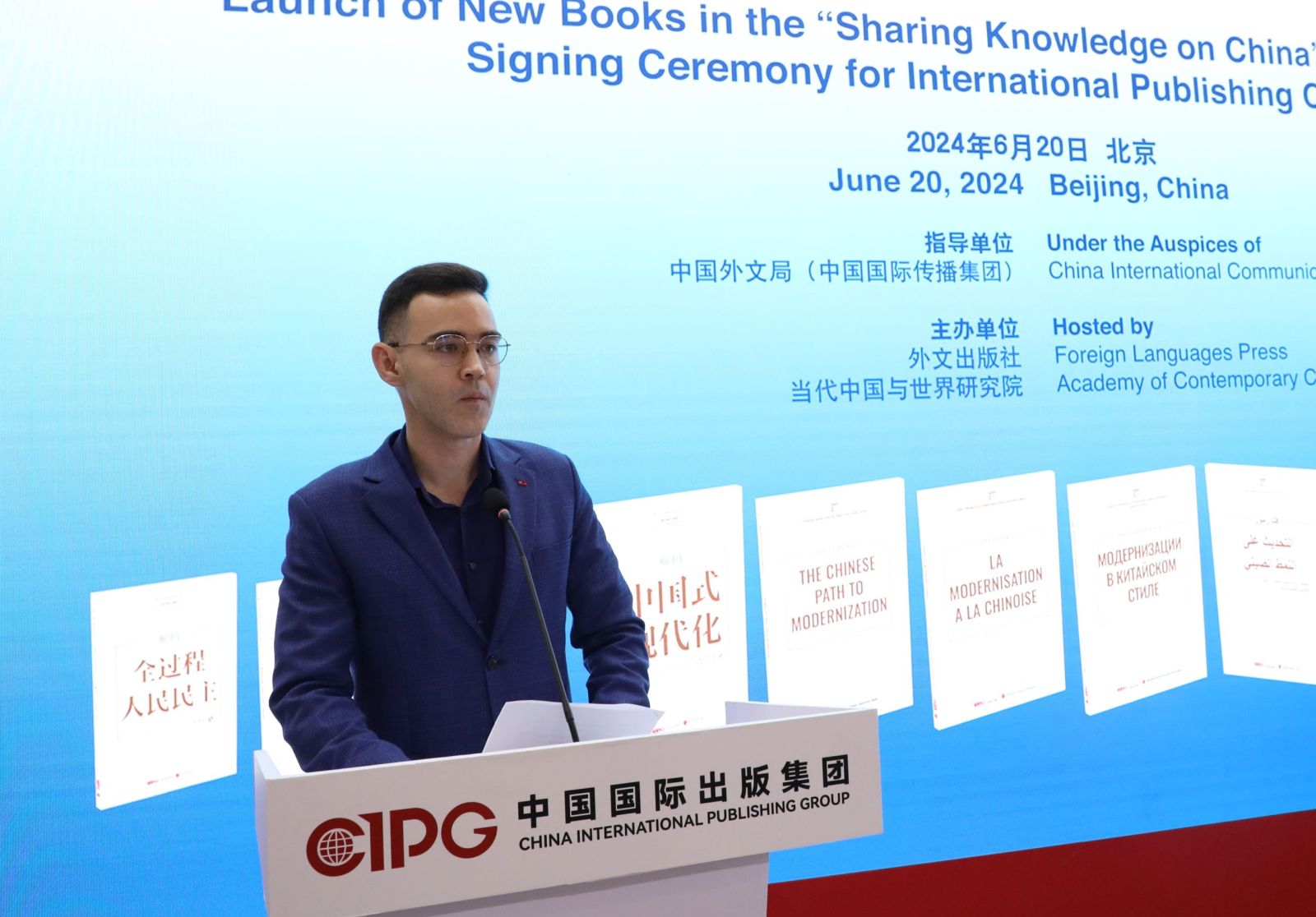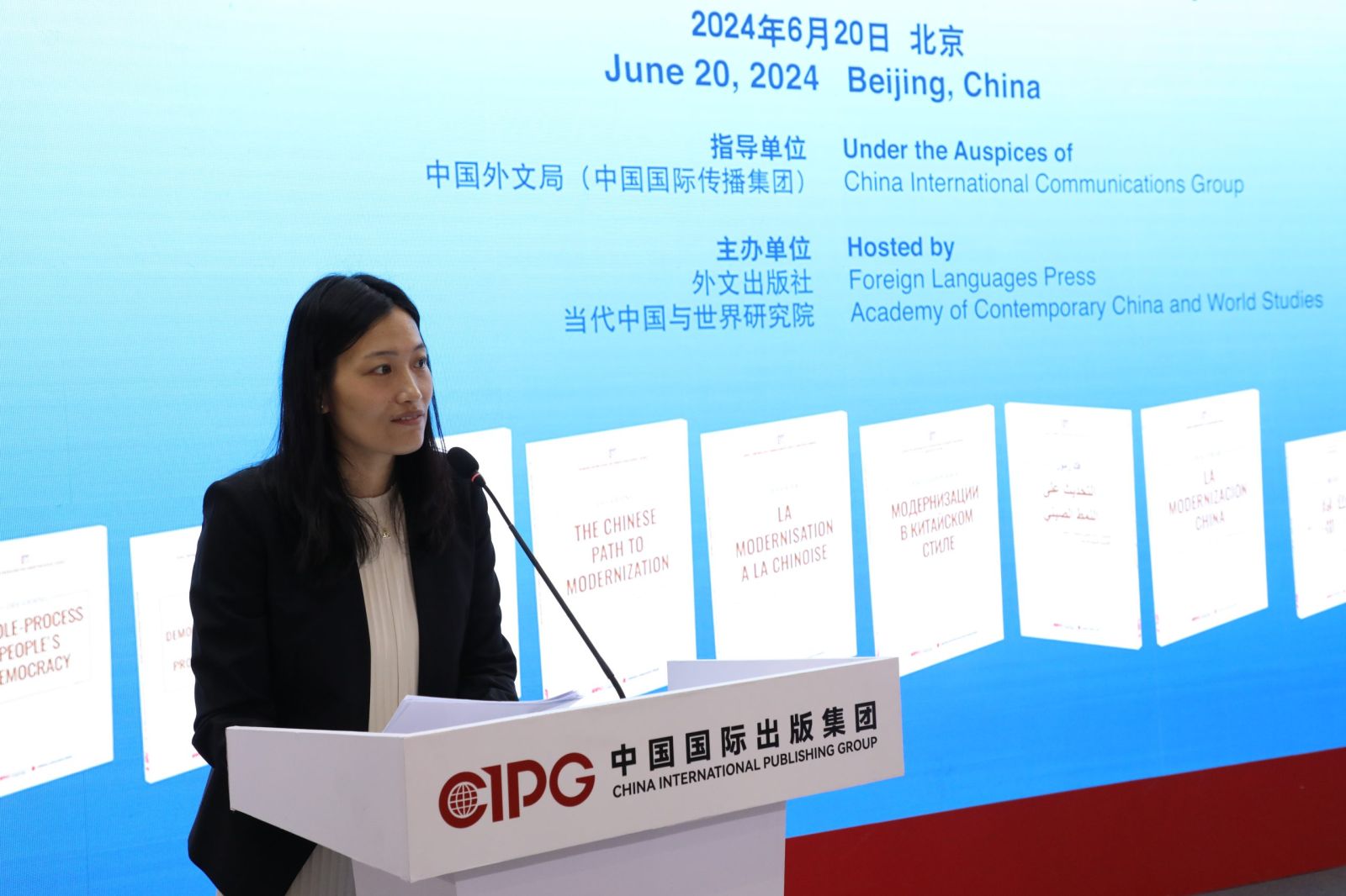 “中国话语”知识分享研究系列由外文出版社与当代中国与世界研究院共同策划。该系列以中、英、法、西、俄、阿、德、日、葡九个文版,通过通俗易懂的知识分享形式,对中国式现代化、全过程人民民主、新质生产力、全人类共同价值、全球发展倡议、全球文明倡议、绿色“一带一路”等中国话语进行阐释和解读,深化中外交流对话。