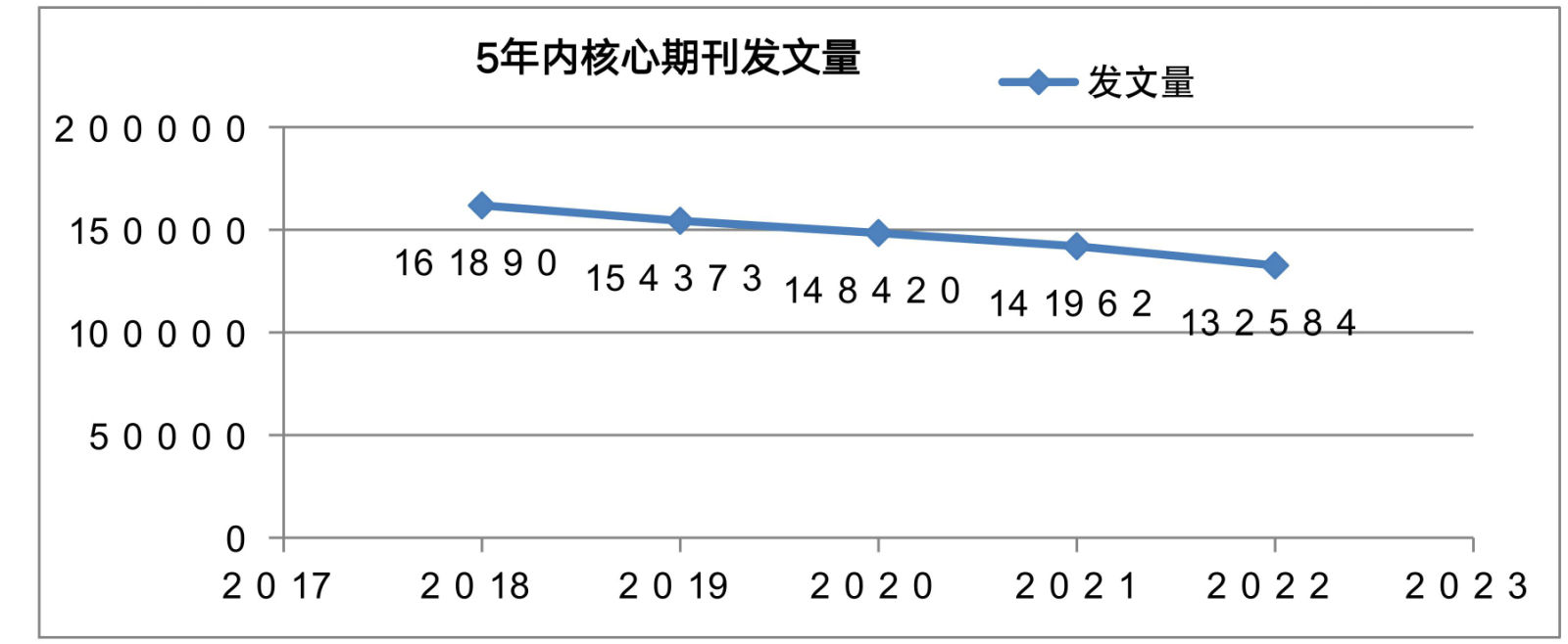 据统计,近5年人文社科核心数据库发文数量统计如图1。可见发文量从2018年的161890篇下滑至2022年的最低值132584篇,呈显著的下降趋势,且仍在延续。反映了近5年,我国学者在讲中国故事,立足中国人文社科学术事业的拓展未加深。