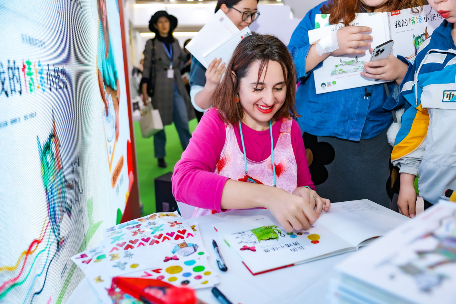 读者纷纷排队等待安娜的签名和合影,相互交流分享着阅读《我的情绪小怪兽》的感受,安娜给每个粉丝绘画不同的图案,粉丝也给安娜送出自己特别准备的礼物,这次见面会成为一段温暖而难忘的回忆。