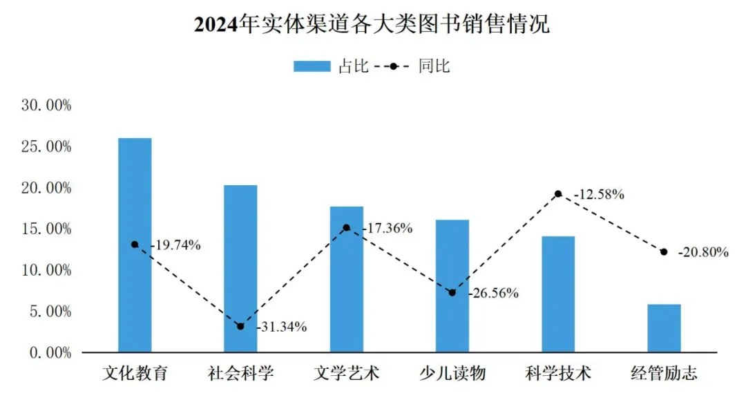 从实体渠道图书各大类情况来看,销售占比最高的仍是文教和社科类。与前三季度相比,文教、社科和文艺类降幅略有扩大,其余类别基本保持相对稳定的状态。社科类降幅超过30%,主要是由于第四季度政治类图书单品销售同比下降60%所致。