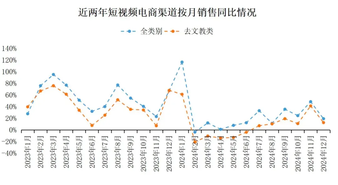 从短视频电商各月销售同比变化情况来看,短视频电商平台的高增速大多是受到平台支柱产品——文教类销售拉升的带动,特别是在大促期间(6月、11月)、开学季和寒暑假(7、8、9月等)体现得更为明显,但2024年第四季度,全类别同比变化曲线跟去文教类市场同比变化曲线逐渐贴近,大众类图书销售有所回暖,主要是受到部分热销图书的拉动。
