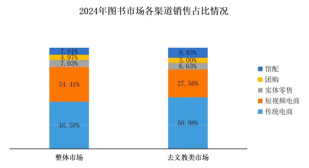 2024年整体图书市场各渠道市场份额情况较为稳定,其中馆配渠道市场份额略有所增长,短视频电商逐年蚕食传统电商市场份额,其中短视频电商的主要发力点为纯文教类市场,其在文教市场的占比高达47%以上,已然超过传统电商渠道(占比38%),成为该类产品的主渠道之一;而在其他大类图书产品中,传统电商仍占据绝对主导地位,是最重要的渠道。