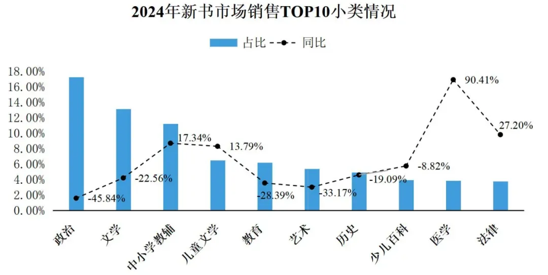 新书方面,2024年新书码洋同比下降22%左右,动销新品数略有所下降,同比下降0.65%。从新书销售TOP10的小类来看,部分中小学教辅、儿童文学、医学和法律类新书表现较好。其中,中小学教辅和儿童文学类图书的销售上升主要是由于热门单品在网络零售渠道的热销,且儿童文学热卖产品大多为IP新作或获奖单品;医学类图书的销售增长则是由于热门单品《漫画讲透黄帝内经》的大幅拉升;法律类新书在团购和网络零售渠道表现均较好。