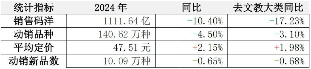 据统计,2024年图书市场码洋为1111.64亿元,同比2023年下降10.50%。2024年图书市场各大类中,文教类仍是唯一销售正增长的品类,增幅为4.50%;剔除文教类的刚需产品后,其他大类图书销售同比下降17.23%,降幅有所收窄。2024年,新书码洋同比下降22%左右,动销新品数略有所下降,同比下降0.65%。2024年整体图书市场的平均定价为47.51元,较去年同期上升2.15%。