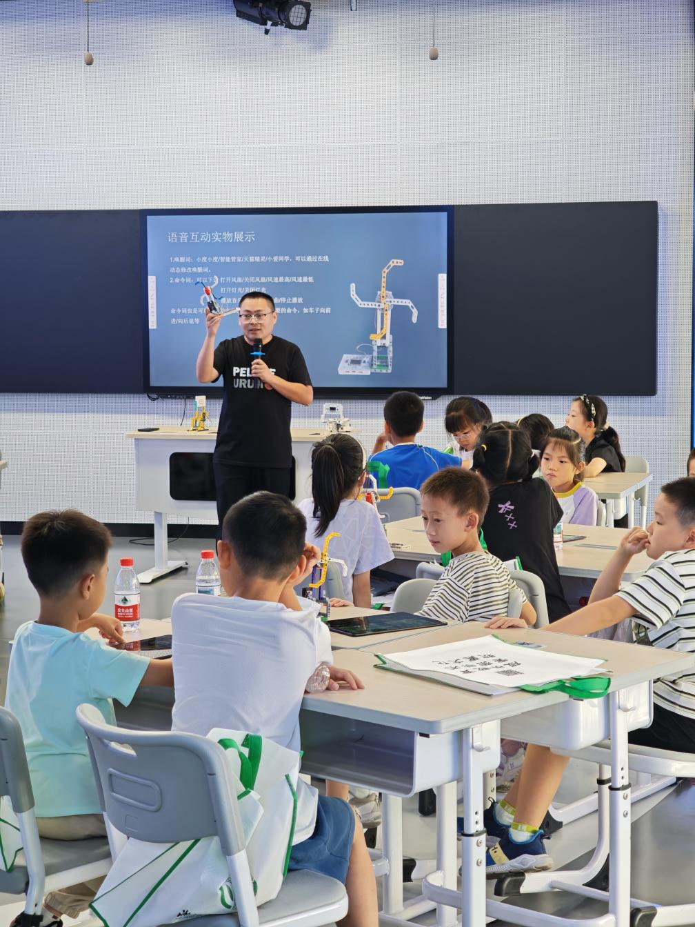 由浙江省金华市环城小学信息技术高级教师曹剑讲授的“人工智能通识课”给学员们带来了全新体验。通过曹老师循循善诱、深入浅出的讲解,学员们获得了对人工智能的初步理解;通过在老师引导下探索尝试AI绘画、视频创作,学员们逐步学会了如何运用语音、文字与AI智能体互动。紧接着,来自国内首家脑机接口领域独角兽企业——强脑科技的卢冠霖工程师为学员们带来了AI语音互动实物展示“会听指令的小风扇”,带领学员们搭建自己的AI互动实物,引导学员们在不知不觉中学习了由浙教社出版的《人工智能》系列教材中的相关实验和知识点。