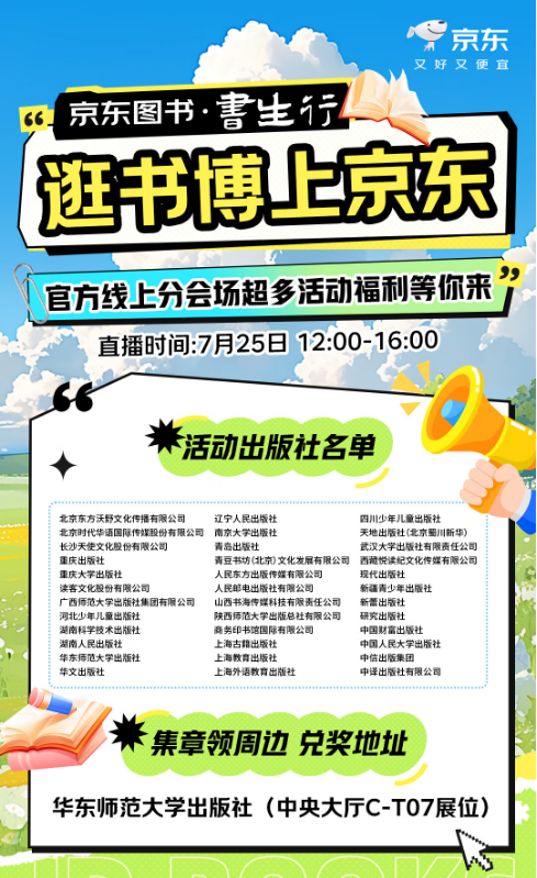 线上直播是京东图书分会场的另一大亮点。7月25日至28日,京东图书将对书博会盛况进行全程直播。无法亲临现场的读者,可以跟随京东采销“云逛展”,以第一视角实时获取书博会最新资讯与热门新书动态。此外,36家合作出版社将轮番做客京东图书直播间,进行别开生面的“编辑PK赛”,从选题背景到内容亮点,以专业视角为读者深度解读、精准筛选优质好书。值得一提的是,每天12:00-16:00,锁定京东图书书博会直播,还有机会赢取知名作家的亲笔签名图书。