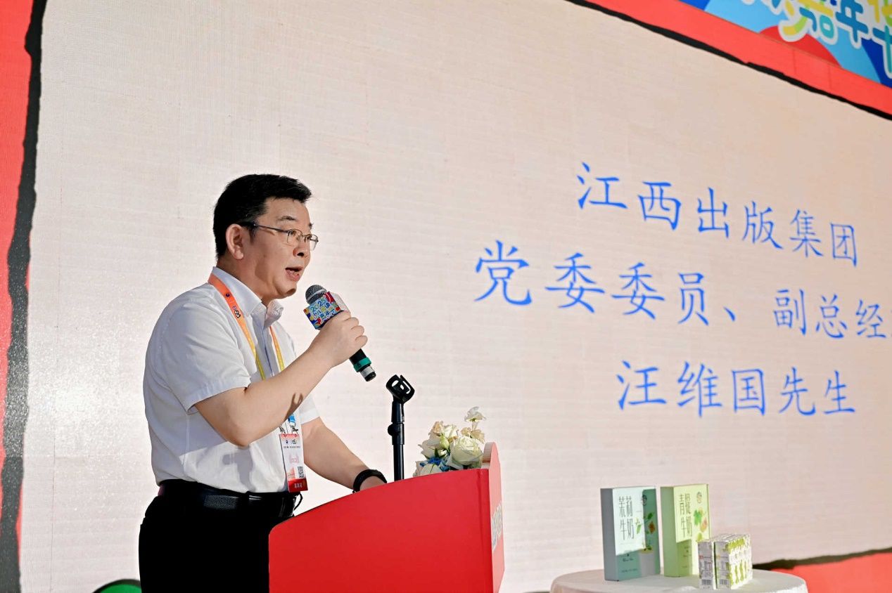 在正式环节中,江西出版集团党委委员、副总经理汪维国先生在致辞中表示——“小猫汤米”的成长史,是中国原创童书从萌芽到繁茂的生动写照,强调其作为“文化种子”的使命。他指出在人工智能技术重塑阅读形态的今天,文字的温度、插画的想象力、故事的共情力,是任何技术都无法替代的。本次活动为孩子封存的时间胶囊,不仅仅是寄给未来的信,更是种下了一粒阅读的种子。江西出版集团将始终守护这份初心,为孩子们搭建通往星辰大海的精神桥梁。