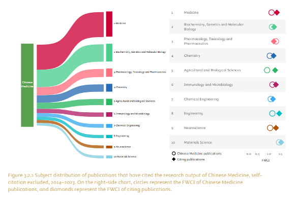 在学术影响力方面,中医药研究的被引用足迹遍布诸多学科。剔除领域自我引用后,引用中医药成果的论文中,医学领域以 46.8% 的比例占据最大份额,生物化学、遗传学与分子生物学以 32.5% 紧随其后;药理学、毒理学与药剂学、化学、农业与生物科学、免疫学与微生物学等也表现出不同程度的交互。大多数学科的施引文献其归一化引文影响力(FWCI)高于被引的中医药原文献,特别是工程与材料科学领域的施引文献FWCI 最高,说明中医药研究不仅被多学科借鉴,还在推动这些领域的知识进步。