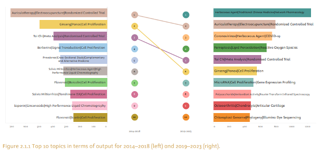 报告展示了“2014年至2018年” 与 “2019年至2023年” 两个时期中医药领域产量最高的研究主题,主要发现包括: