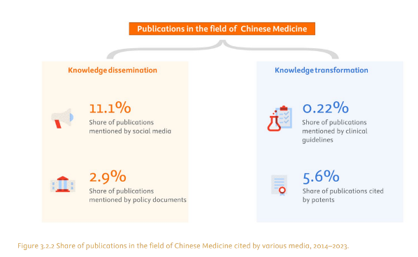 中医药研究同样展现出卓越的社会影响力。报告显示,11.1% 的中医药论文被社交媒体讨论,2.9% 被政策文件引用,0.22% 进入临床指南,5.6% 被专利引用,体现了其从实验室到公众、从政策到产业的全方位影响力。