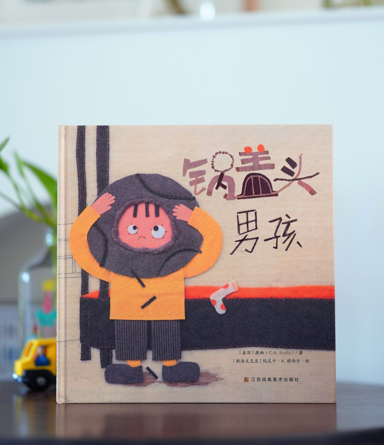 《锅盖头男孩》则展现了另一种艺术张力,画师是来自斯洛文尼亚国宝级艺术家玛尼卡·K. 穆西尔。她是苏美童书的老朋友,她引进中国的第一套作品“布一样的绘本系列”就由苏美童书出版,其中《捣蛋小猪》屡获殊荣,荣获2016年塞尔维亚“创意插画特别奖”,2015年斯洛文尼亚“最美图书”等国际大奖。她用布料的纹理与针线的温度,构建出可触摸的柔软世界。主角小男孩巴尼从坚守 “锅盖头” 发型到接纳脱发的成长,教会孩子在变化中守护本真。穆西尔这本原创绘本延续了她布艺拼贴而成的艺术特色,每一幅画面都充满了温暖和质感,每一幅拼贴都饱含着生活的智慧。