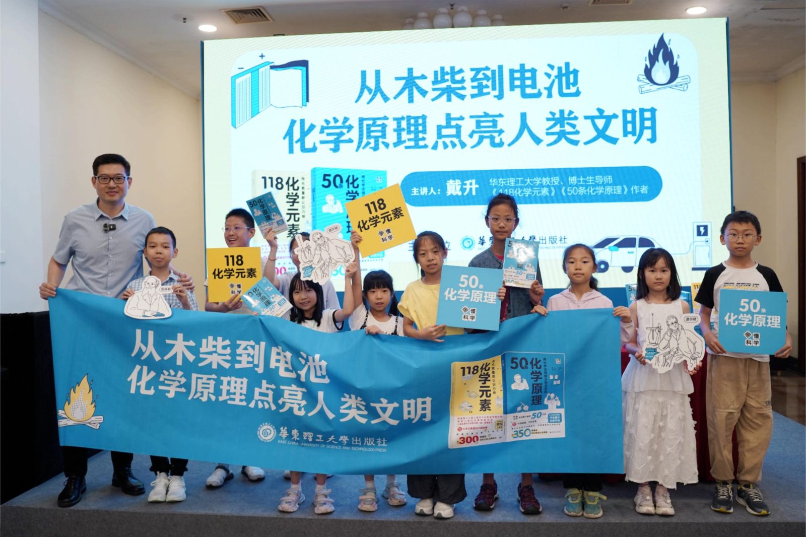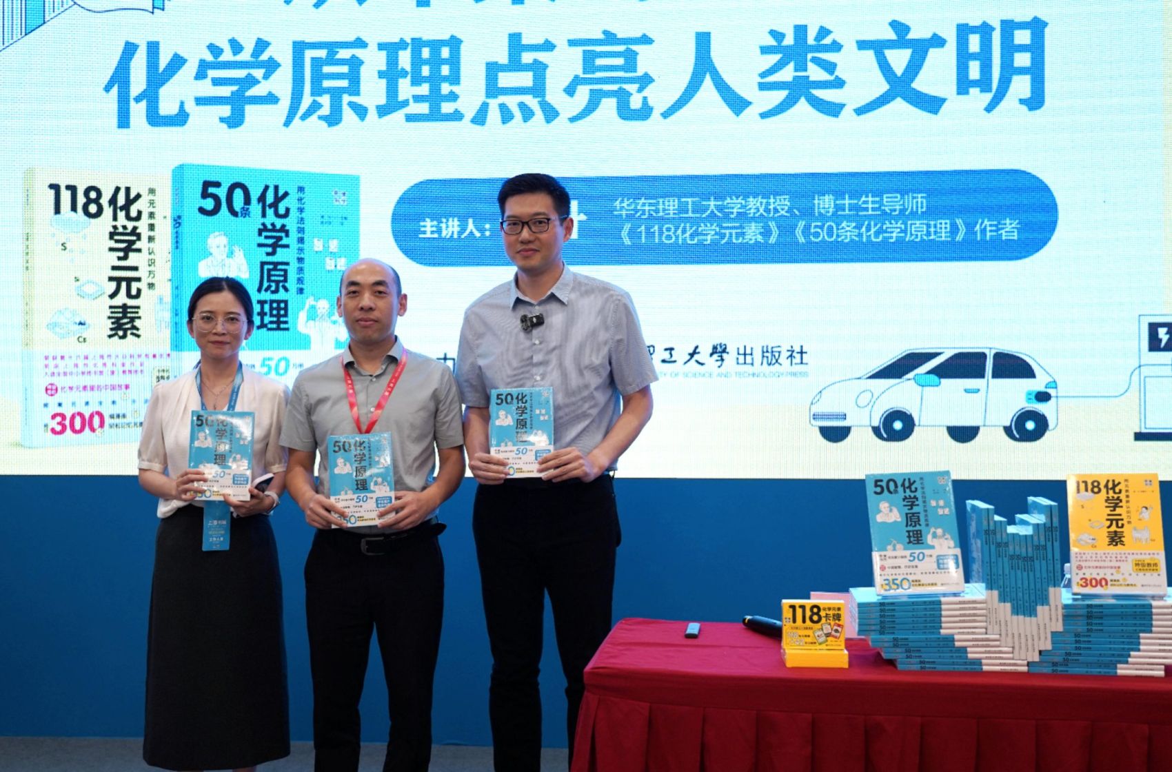 2025年8月17日晚,《50条化学原理》新书发布会暨主题分享会“从木柴到电池:化学原理点亮人类文明”在上海书展举行。活动由华东理工大学出版社主办,作者、上海市“科普新锐人物”戴升教授现场作专题演讲,华东理工大学出版社社长王雪及科普项目组编辑团队出席,吸引了众多读者参与。