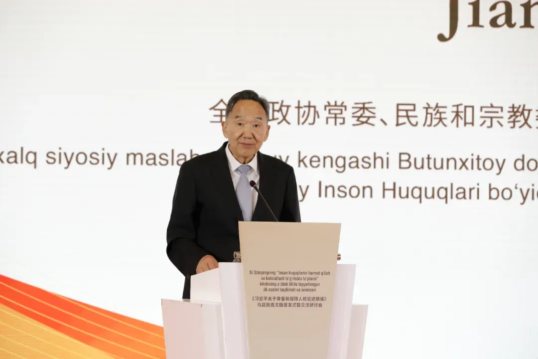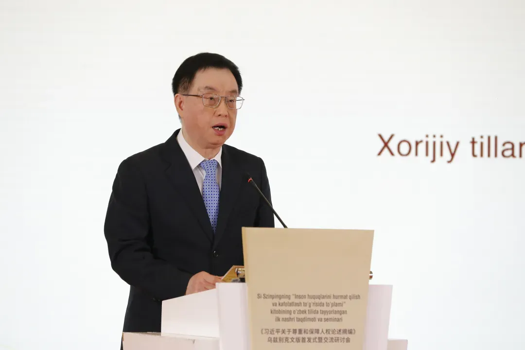 蒋建国在致辞中表示,《习近平关于尊重和保障人权论述摘编》是一部凝聚深厚人民情怀、蕴含丰富治理智慧、关怀全球人权治理的权威著作,贯穿了以人民为中心的人权理念,体现了人民至上的价值取向,平等共享的制度安排以及公平正义的国际担当。该书在乌兹别克斯坦的翻译出版,是中乌在历史相通、现实联通、理念贯通的土壤上进行的一场关于人权的对话与互鉴,希望为乌兹别克斯坦人民观察和感知中国人权打开一扇新的窗口,搭建一座中乌知识界和民众间相互理解的桥梁。