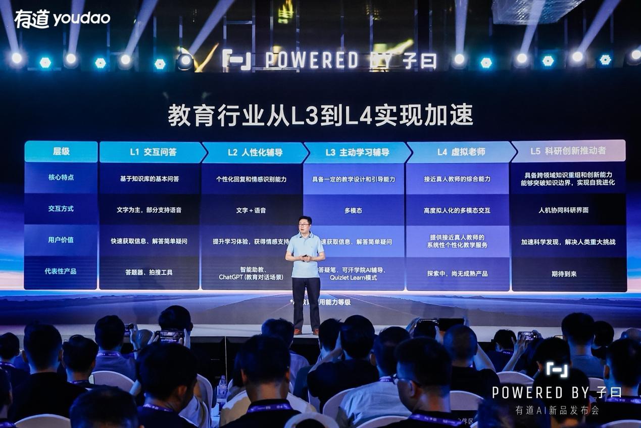 会上,网易有道CEO周枫提出教育AI应用能力L1-L5分级标准,并指出,目前教育AI正加速升级,将带来千人千面的个性化课堂,让家庭学习更高效,让教师拥有随时在线的“超级智脑助手”。