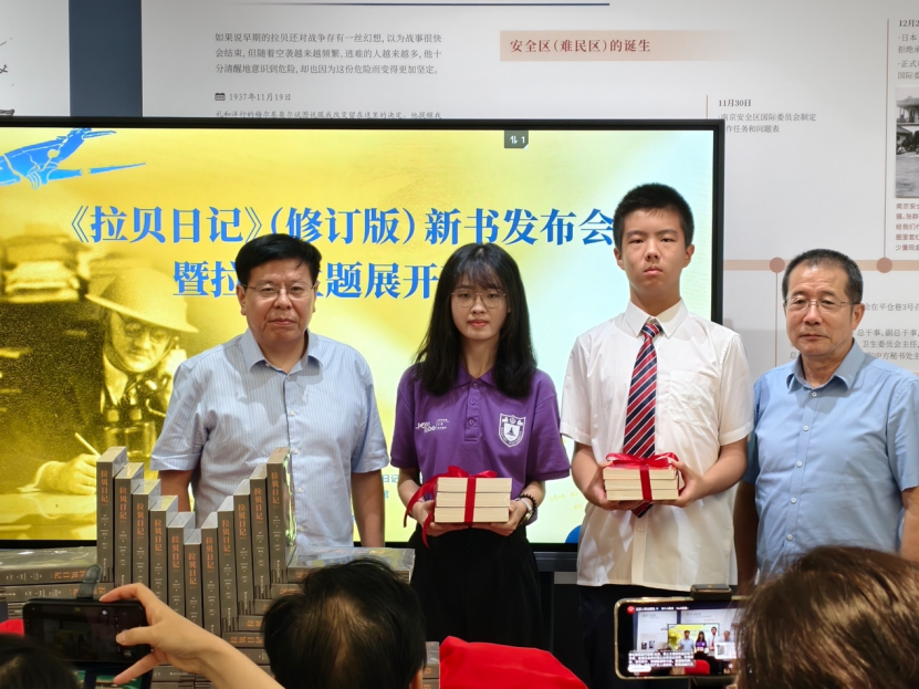 活动现场,中共南京市委宣传部副部长、侵华日军南京大屠杀遇难同胞纪念馆馆长周峰,江苏人民出版社社长王保顶,南京大学拉贝与国际安全区纪念馆主任杨善友,以及《拉贝日记》译者刘海宁共同为新书揭幕。王保顶社长、刘海宁先生分别向南京大学“拉贝日记与和平城市”团队、南京外国语学校学生代表赠送《拉贝日记》修订版、《拉贝日记》青少版。南京外国语学校学生代表王敬一、王美錕、缪言用中德双语朗诵《拉贝日记》选段。