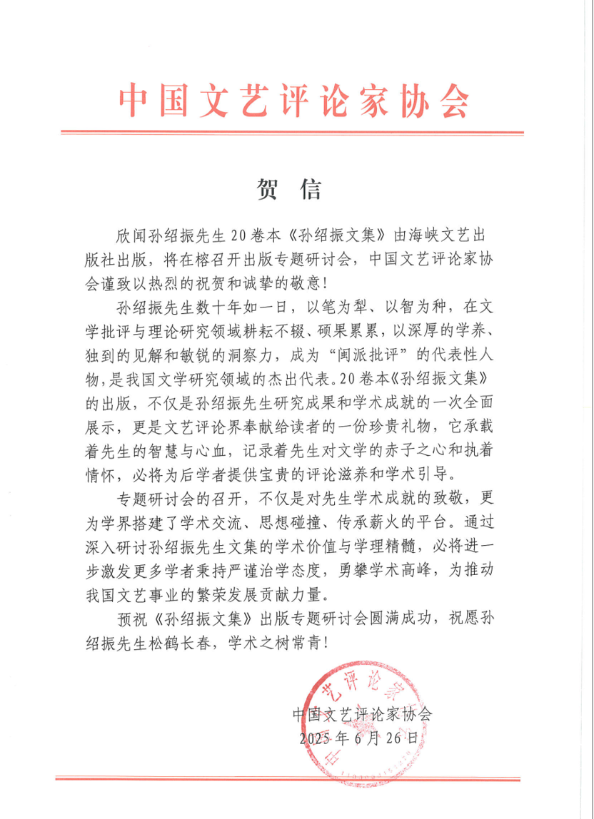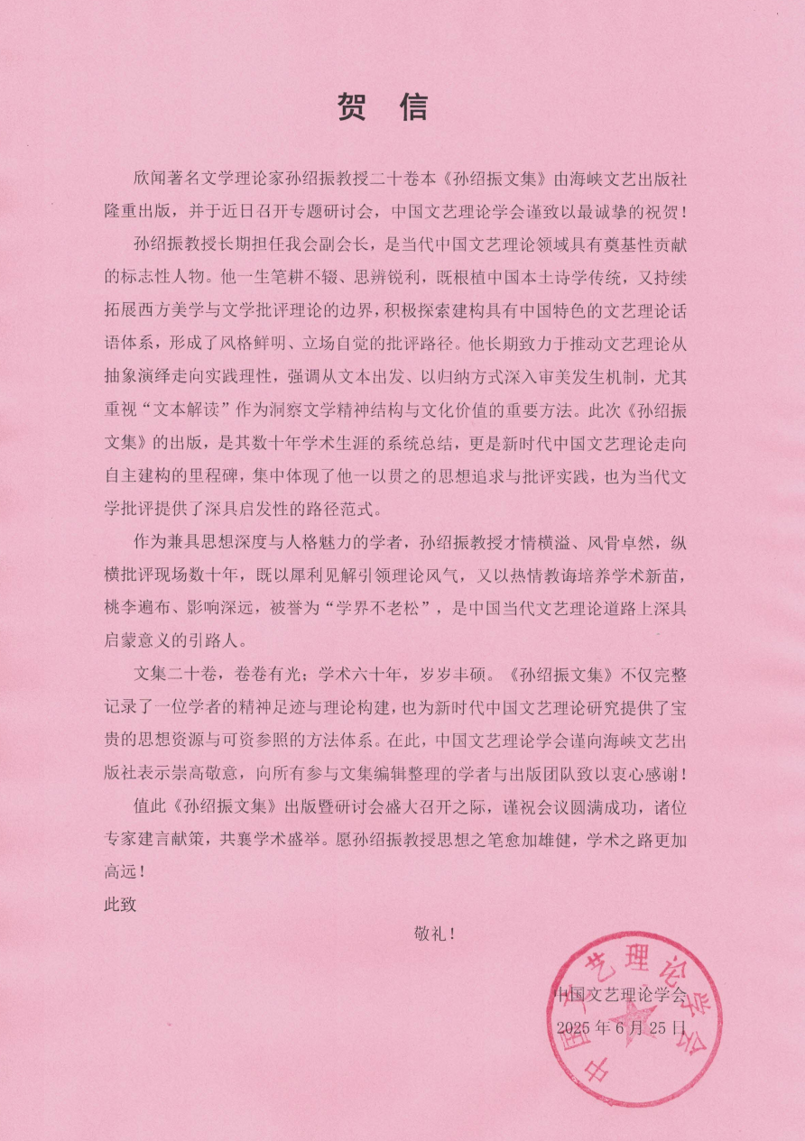 研讨会开幕式由北京大学中文系教授陈晓明主持。北京大学中文系党委书记贺桂梅首先致辞。她指出,二十卷《孙绍振文集》汇编了孙绍振先生迄今为止全部的代表性学术著作和文学作品,涵盖了文学理论建构、文学批评、演讲、语文教育、文学创作等多方面内容。在当今这一建构中国自主知识体系的关键时期,孙绍振先生著述的结集出版具有重要意义。福建师范大学校长、教授郑家建随后致辞,他表示,在孙绍振先生的影响下,福建师范大学不仅成为中国文坛教育界的中坚力量,更为推动两岸语文交流与融合做出了贡献。福建师范大学将以文集出版为契机,系统梳理和深入研究孙绍振先生的学术思想体系,推动相关学科理论创新与体系建设,为构建中国特色哲学社会科学学科体系、学术体系和话语体系贡献福建师范大学的力量,谱写新时代中国语言文学研究与发展的新篇章。中国社会科学院大学教授、中国社会科学院原副院长张江代表学界作主旨发言。他指出,孙绍振先生为中国文学理论与话语体系建设提供了重要的理论指引,感召后辈学者继续投身于文学的讨论、研究之中。此外,中国文艺理论学会、中国文艺评论家协会与著名作家莫言也发来贺信,高度赞扬孙绍振先生为当代中国文艺理论建设做出的奠基性贡献,指出此次二十卷本《孙绍振文集》的出版,是新时代中国文艺理论走向自主建构的里程碑,为当代文学批评提供了深具启发性的路径范式。