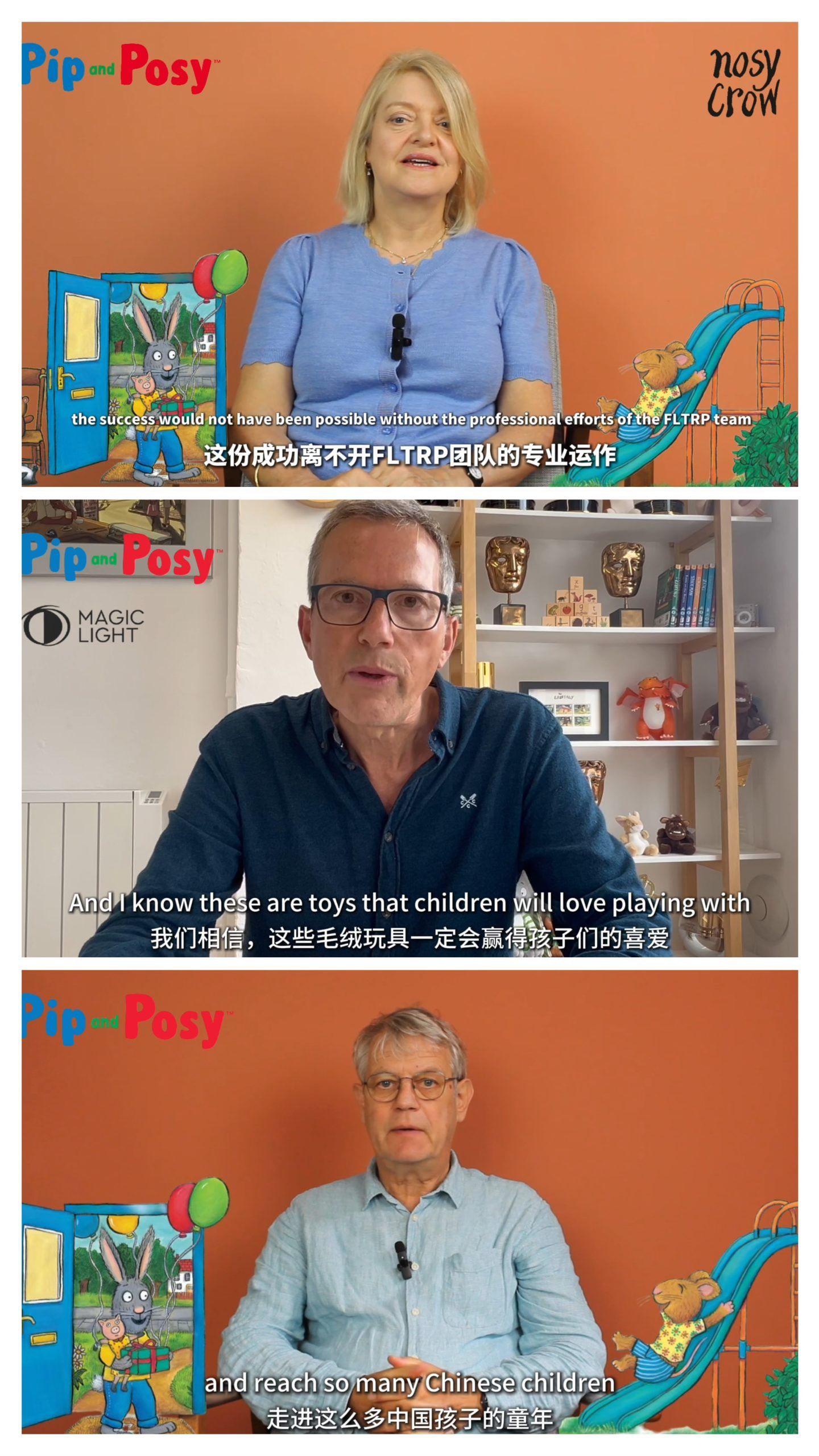 英国图书版权方代表、衍生品版权方代表及绘本作者、国际绘本大师阿克塞尔•舍夫勒分别通过视频表达了祝贺与期待。舍夫勒动情地说:“我曾想象孩子们抱着它们入睡的样子——如今梦想成了真。”