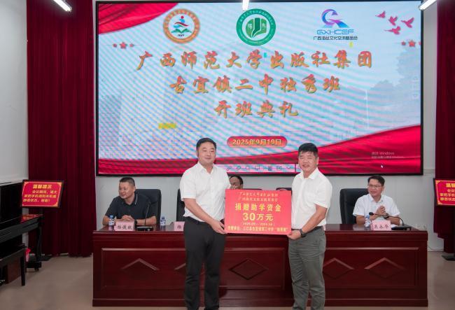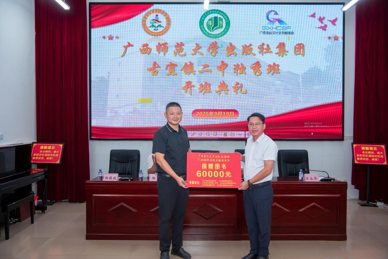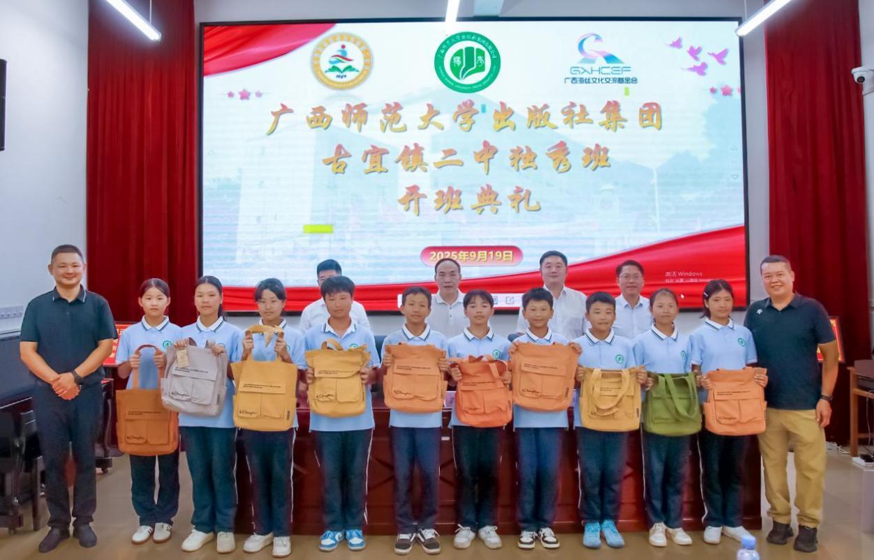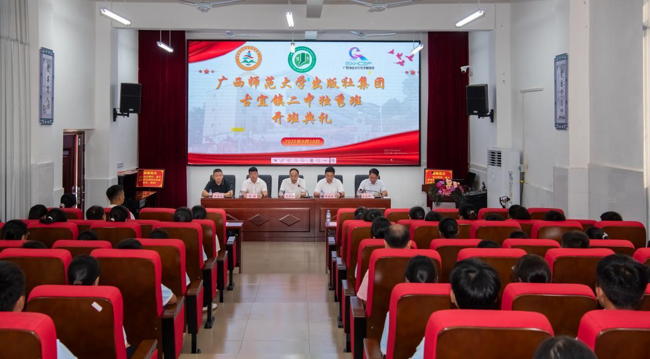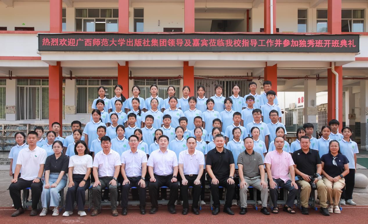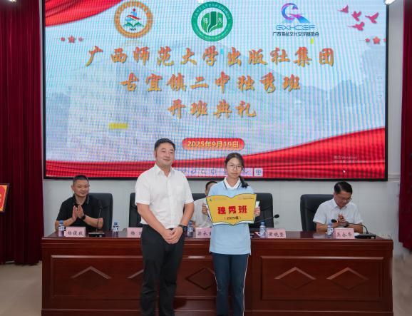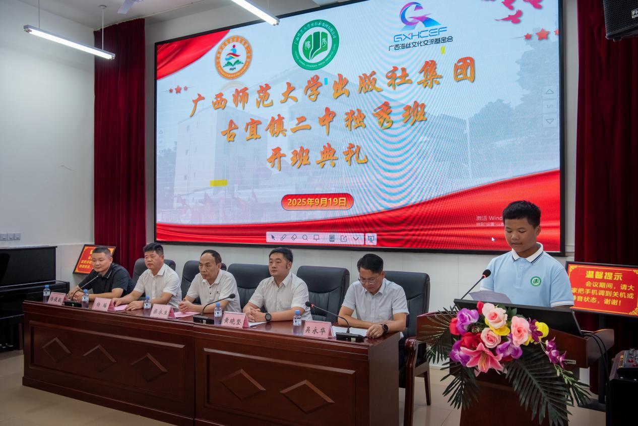 9月19日,广西师范大学出版社集团资助的新一届“独秀班”开班典礼在三江侗族自治县古宜镇第二中学举行。三江侗族自治县人大常委会副主任梁永生,广西师范大学出版社集团有限公司党委副书记、纪委书记黄晓坚,工会副主席杨俊毅,三江侗族自治县教育局党组书记、局长吴永华,广西海丝文化交流基金会执行秘书长黄珊虎以及出版社集团、古宜镇第二中学的相关领导嘉宾出席了开班典礼。