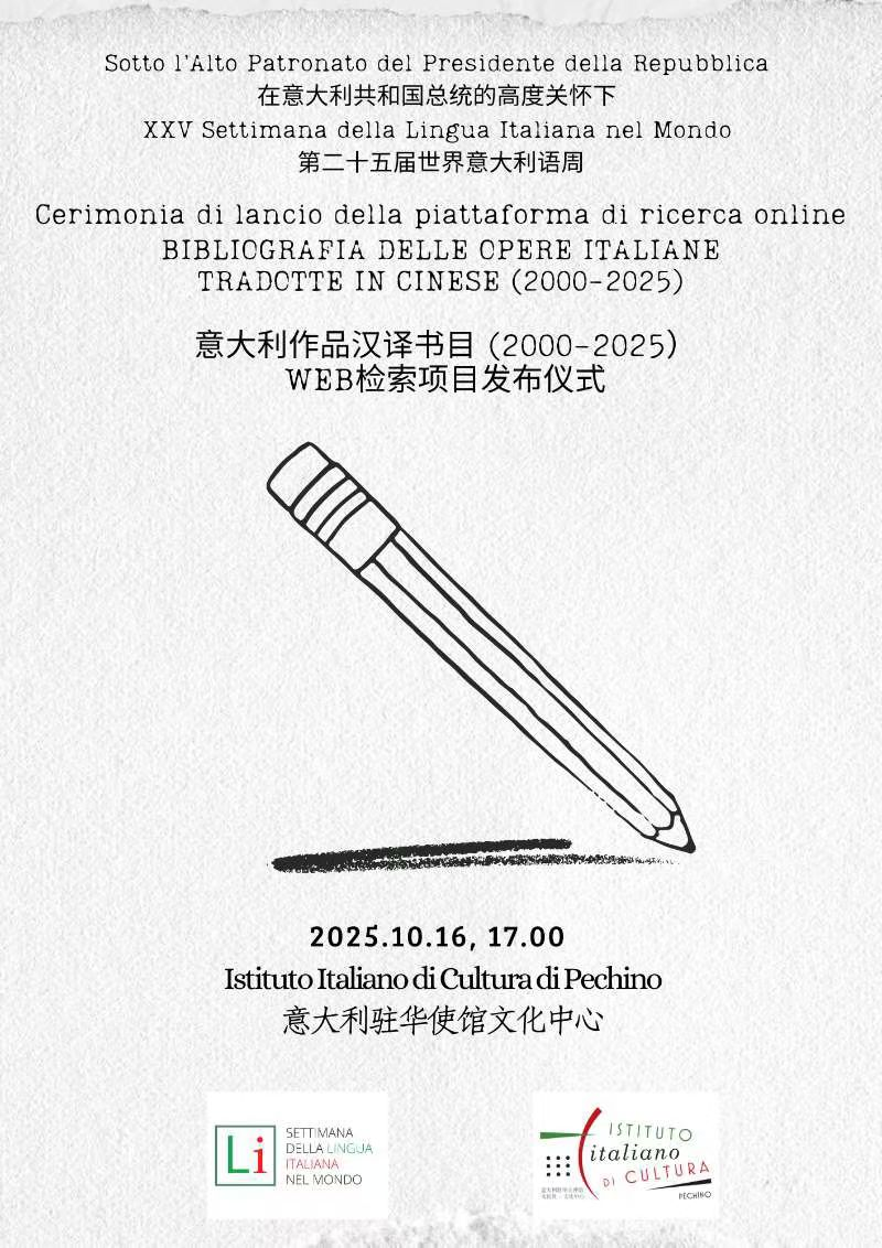 为庆祝中意建交五十五周年,意大利驻华使馆文化处策划,并与北京大学数字人文研究中心、北京大学外国语学院意大利语专业、北京外国语大学意大利研究中心和北京航空航天大学意大利研究中心合作,于2025年10月16日在意大利驻华使馆文化中心正式发布“意大利作品汉译书目(2000-2025)WEB检索平台”。