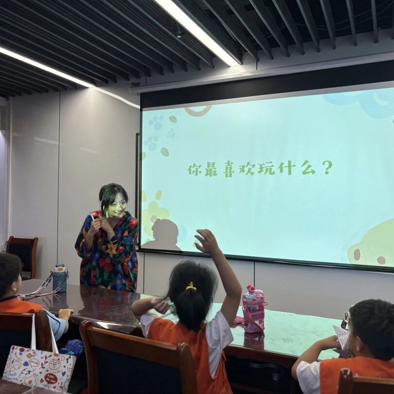 王晨老师与孩子们分享了自己生活中对手工的热爱,通过展示一张张精美的刺绣图片,瞬间拉近了与孩子们的距离,大家也争先恐后地举手,分享自己的兴趣领域。