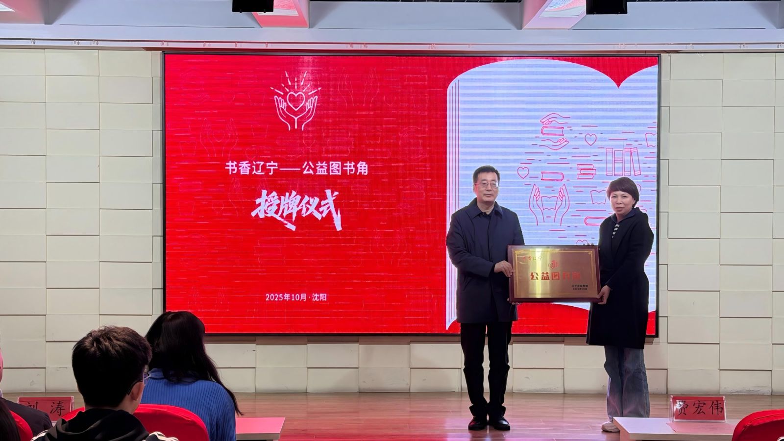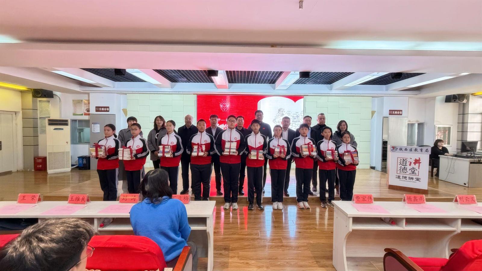 活动在杏坛中学八年二班学生演绎的课本剧《五四运动》中拉开序幕。在授牌仪式上,费宏伟总经理向杏坛教育集团授予“书香辽宁——公益图书角”牌匾,随后各位领导向学生代表赠予涵盖文学、科普、历史等多个领域的精选书籍300余本。