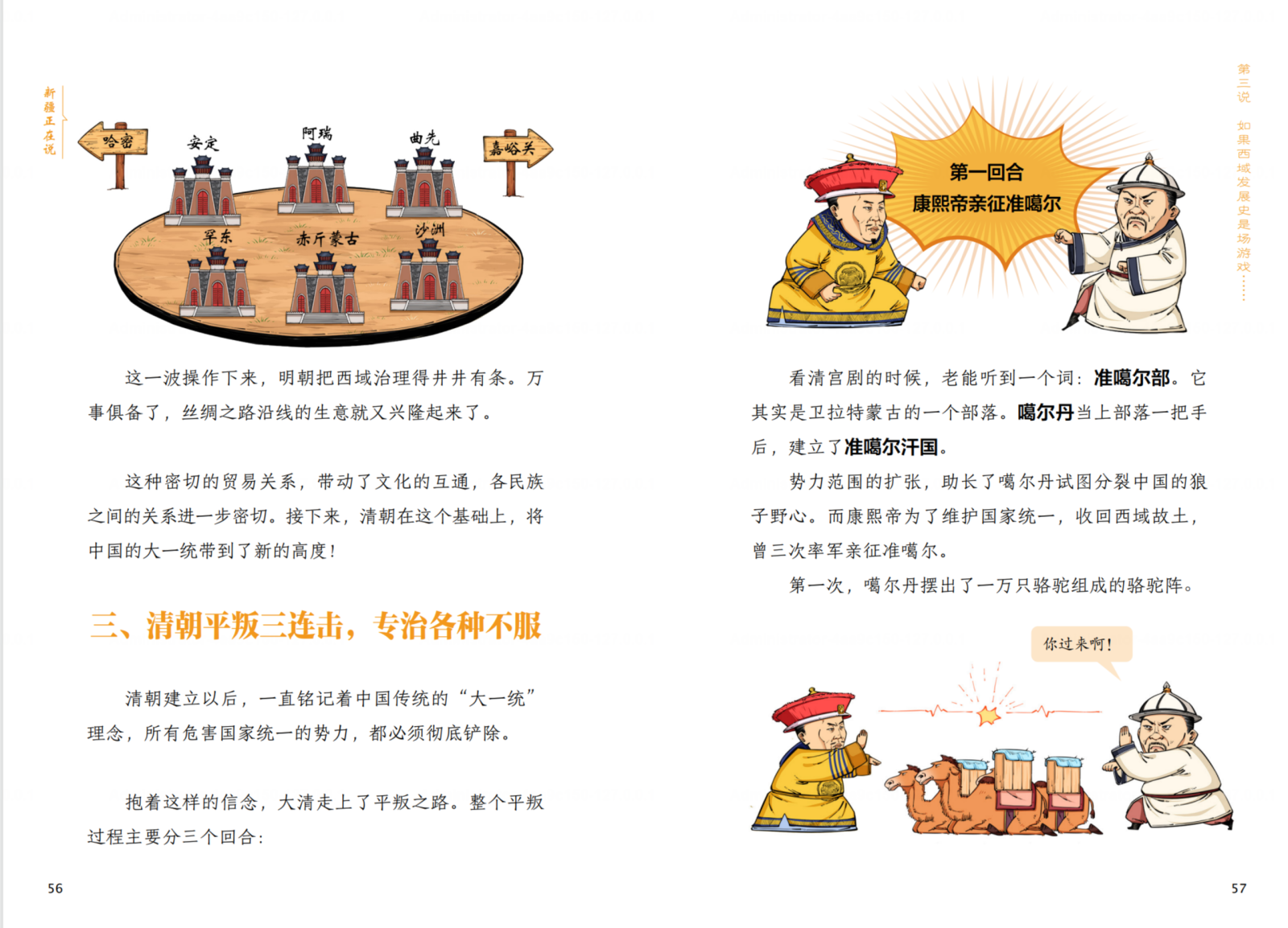 “创作《新疆正在说》对我们团队来说是一次全新的挑战。”作者陈磊坦言,“如何在保证趣味性的同时,又能准确传达新疆的历史文化和风土人情,是我们一直思考的问题。最终,我们决定从逻辑化、视觉化、兴趣化入手,深入挖掘新疆特色,将枯燥的历史知识转化为生动有趣的漫画故事。比如,在讲述清朝平叛历史时,我们借鉴了‘游戏’创意,将大清平叛分为三个回合制,以‘KO’敌人的形式呈现,让读者在轻松愉快的氛围中了解新疆的历史变迁。这种创意获得青少年读者好评,有孩子评论‘历史课要是这么讲,我肯定不睡觉’。”