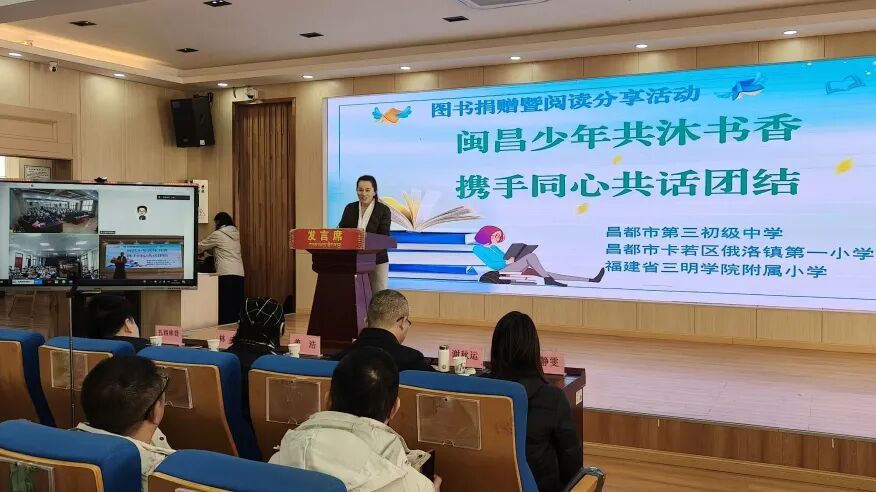 昌都市教育局党组副书记、副局长谢秋运在讲话中指出,书籍是智慧的结晶,也是文化传承的载体,更是连接心灵的桥梁。此次图书捐赠暨阅读分享活动,送来宝贵精神食粮,助力藏东学子成长,进一步深化闽藏情谊,是“文化润藏”的生动实践,也是推进“阅爱闽昌”青少年学生阅读促进行动的具体举措,充分彰显了“山海情缘深、闽昌一家亲”的深厚情怀。要用好用活宝贵图书资源,深入推进“书香校园”建设,引导学生养成阅读习惯,好读书、读好书、善读书,以书香启迪智慧、浸润心田,树立远大理想,掌握丰富知识,不断开阔视野,争当爱党爱国、勤奋好学、全面发展的新时代好少年。