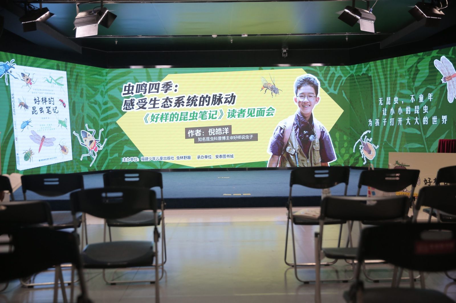2025年11月1日晚,“虫鸣四季:感受生态系统的脉动”——《好样的昆虫笔记》读者见面会在福州安泰图书城举行。图书作者、知名少年昆虫科普博主倪皓洋(@好样说虫子),与其母亲叶云美女士以及虫林野趣负责人大王老师齐聚一堂,与现场众多热爱自然的小读者和家长们,共同度过了一个充满知识与趣味的昆虫探索之夜。