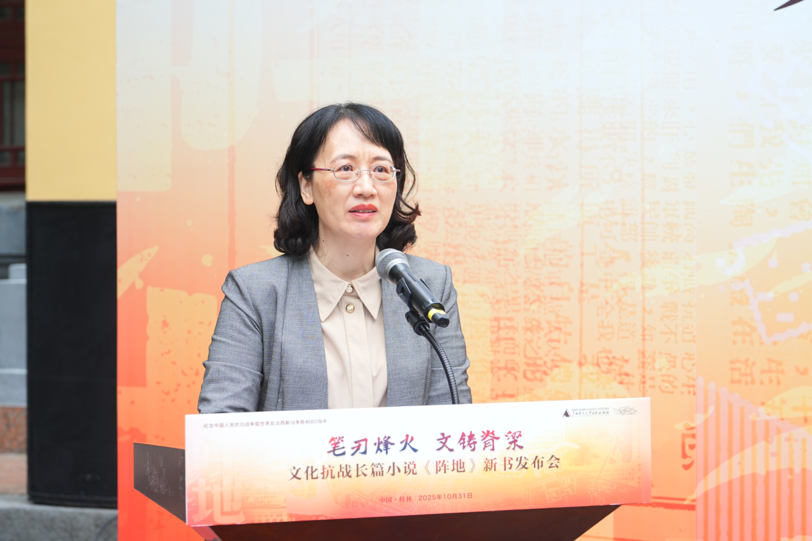 黄晓娟在致辞中表示,《阵地》的出版,不仅是对历史的深情回望,更是对未来的无限期许。广西师范大学出版社作为学校重要的文化名片和学术窗口,推出《阵地》这一重要的主题出版作品,是出版社深度挖掘区域文化资源、主动服务国家文化战略的重要体现,彰显了出版社作为优秀文化企业的远见、担当与情怀。黄晓娟指出,广西师范大学将一如既往地支持出版社出版更多扎根时代、反映历史的优秀作品,在建设社会主义文化强国、教育强国的伟大征程中,贡献应有的“师大力量”。