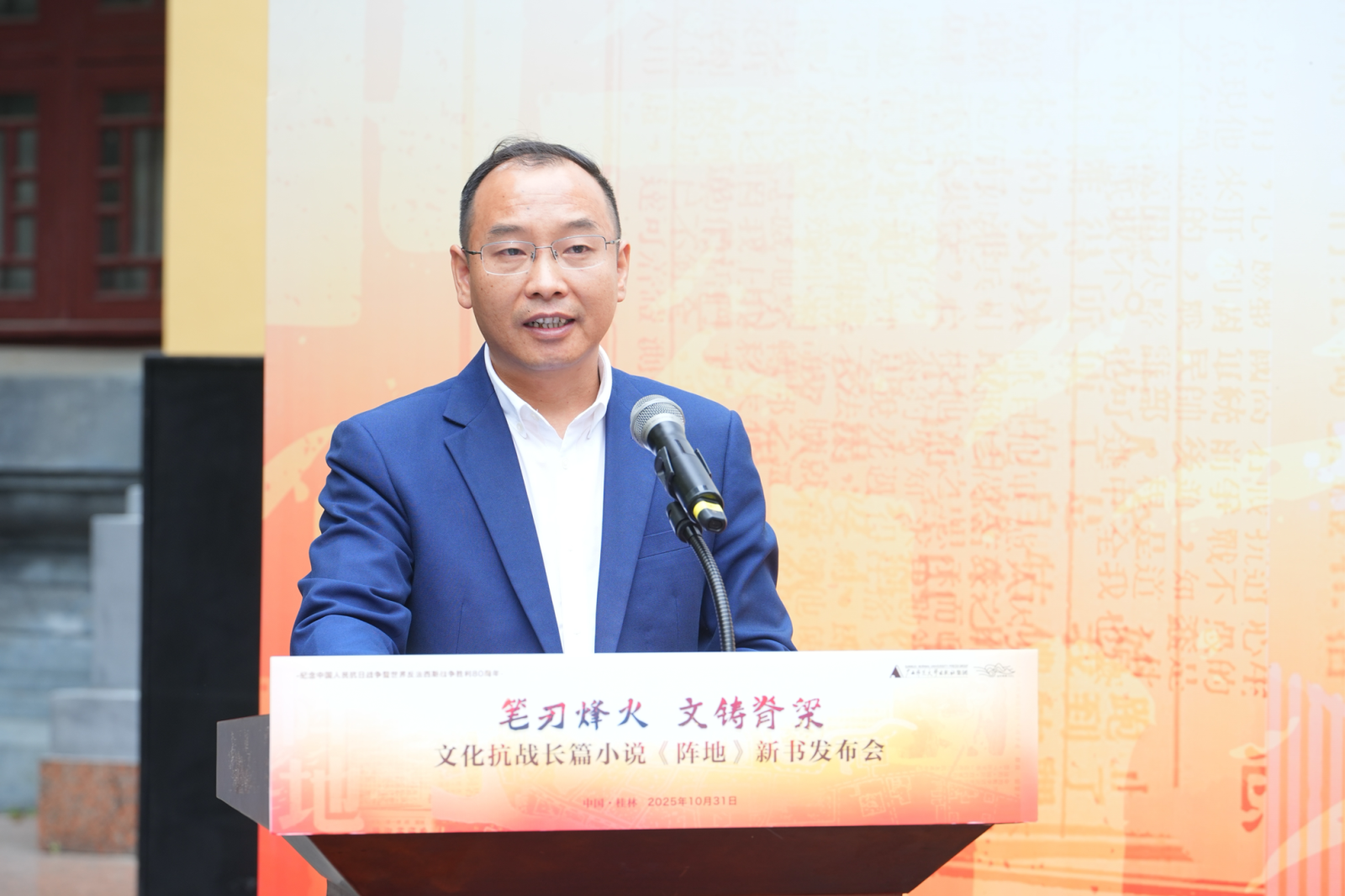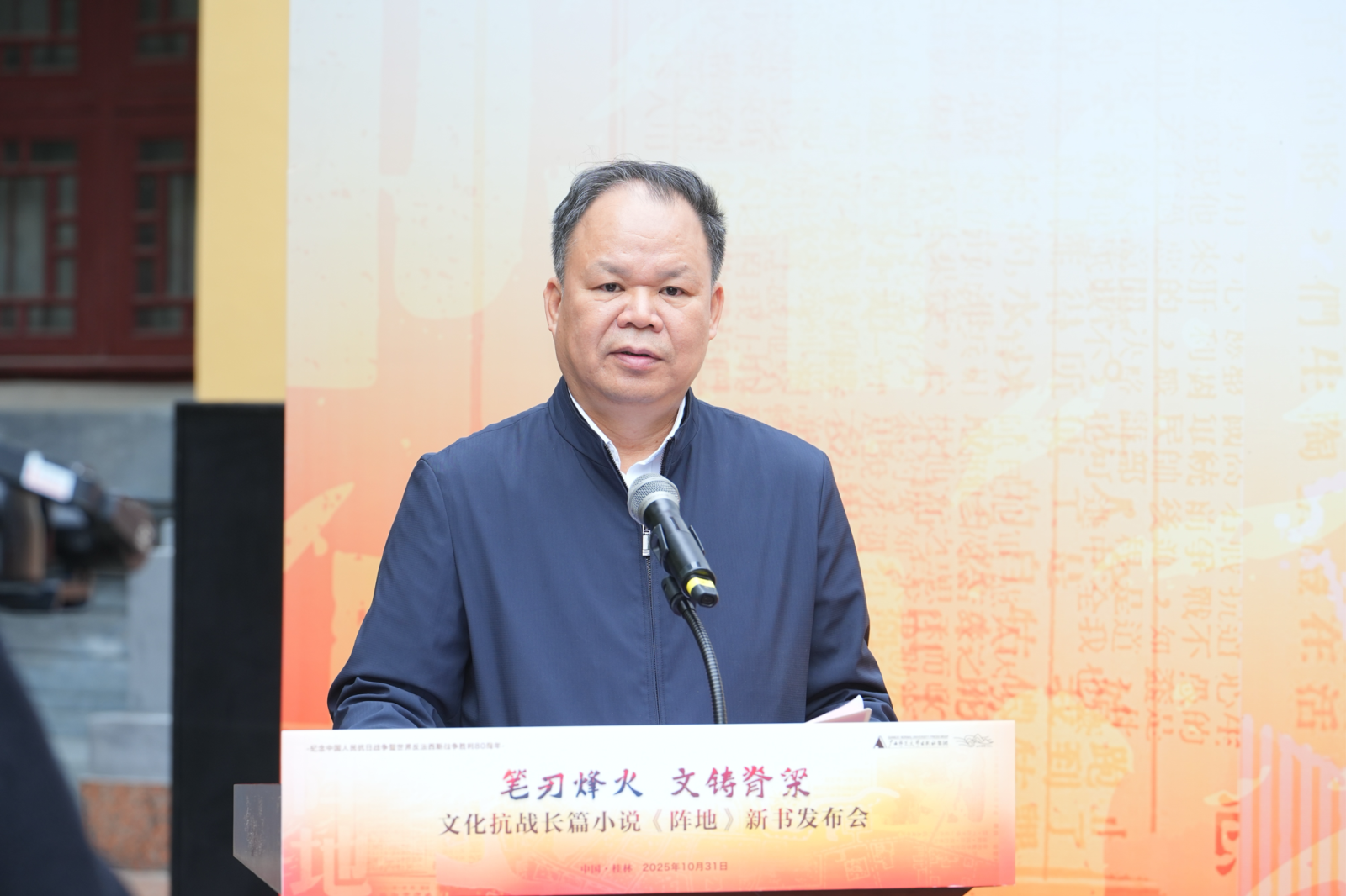 陈伦元在致辞中指出,小说《阵地》以深厚的历史底蕴和精湛的艺术笔触,生动再现80年前中国文化界人士和桂林民众为抗击日本侵略所经历的同仇敌忾岁月,深刻揭示“文化抗战”这一特殊战场的伟大意义。历史回响,总是与时代呼唤相交织。站在新的历史起点上,重温桂林作为抗战文化阵地的峥嵘岁月,不仅仅是缅怀先烈,更是为了汲取穿越时空的精神力量,弘扬在困境中开拓、在压力下坚守、在融合中创新的时代精神。