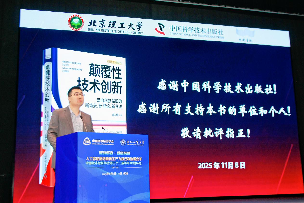 11月8日下午,由中国科学技术出版社出版的《颠覆性技术创新》一书在“AI驱动的数字经济新生态”平行论坛上正式发布,引发学界广泛关注。该书由北京理工大学曲冠楠特别研究员撰写,系统梳理了颠覆性技术创新的理论演进、识别机制与政策路径,结合全球典型案例与中国实践,深入探讨了人工智能时代下颠覆性技术的生成逻辑与治理策略。