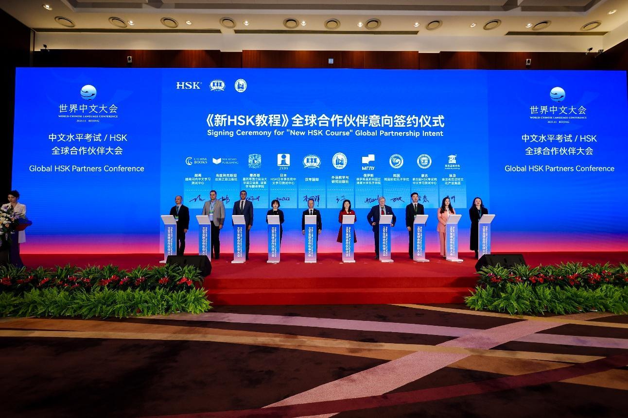 活动现场,李佩泽董事长、王芳社长与HSK日本事务局、越南河内中文学习测试中心、韩国彩虹孔子学院、俄罗斯莫斯科国立语言大学孔子学院、蒙古HSK考试院中文学习测试中心、乌兹别克斯坦丝绸之路出版社、墨西哥国立自治大学语言与翻译学院、埃及希克迈特文化产业集团八家海外合作伙伴,共同签署《新HSK教程》合作意向,携手推动HSK考试与优质教育资源的全球共享与深度合作。