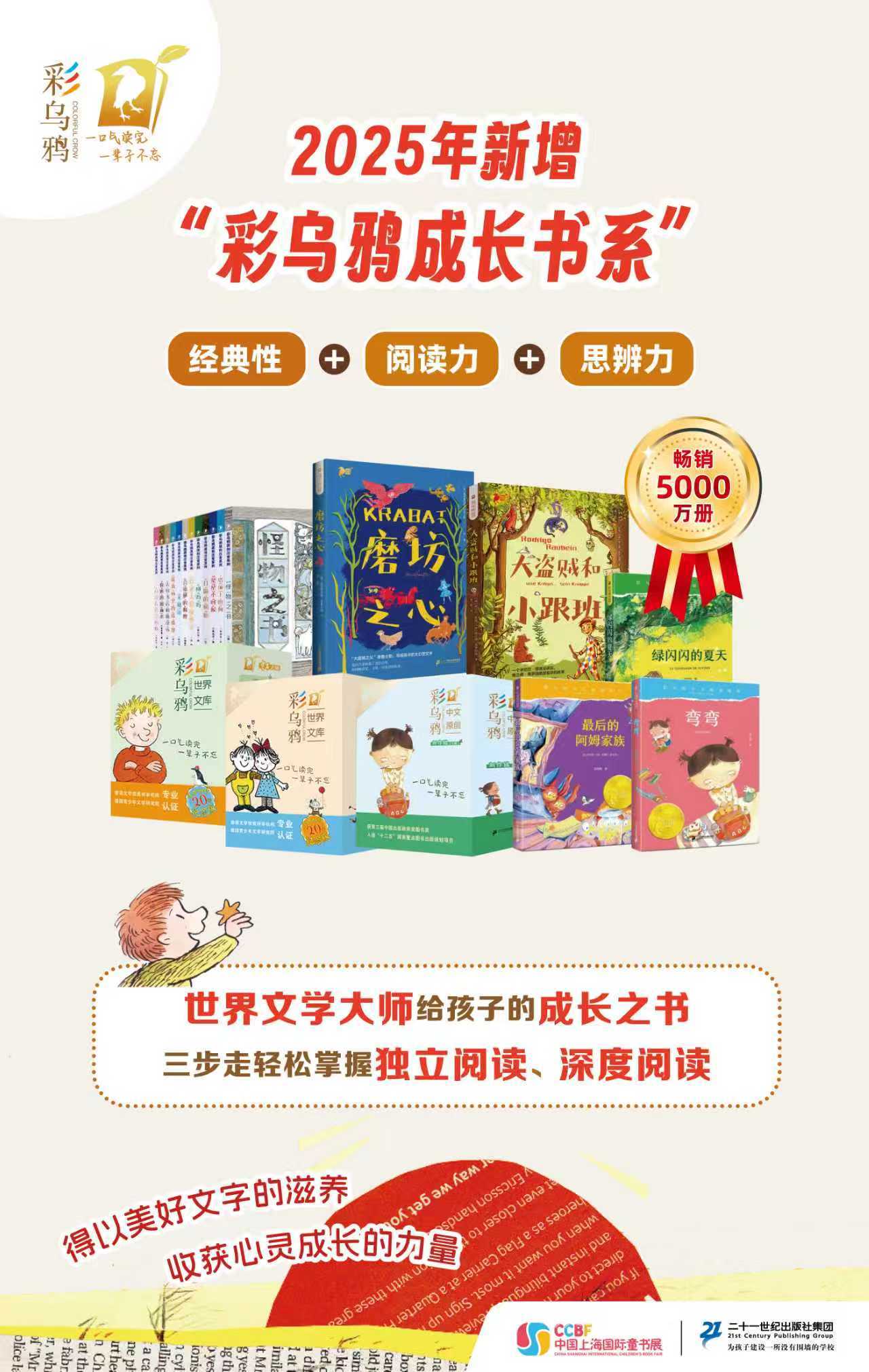 2025年,为贴合不同读者的阅读需求,新开辟“彩乌鸦成长书系”,聚焦10岁以上青少年读者,精选国外经典的优秀的成长题材小说,围绕成长教育主题,为高年龄段读者搭建起一座跨越文化、直面未来的桥梁。6月,该系列已出版首部作品,由德语文学大师奥德弗雷德·普鲁士勒创作的幻想文学《磨坊之心》(原名《鬼磨坊》),12月将出版“大幻想之父”米切尔·恩德的最后遗作《大盗贼和小跟班》,后续将陆续出版《希望之鸟》《世界,它飞得更高》等经典作品,让孩子得以“美好文字的滋养,收获心灵成长的力量”。该系列每本图书还邀请一阅书院的特级名师编写定制阅读服务,增加“名师视频课”“课件PPT”“阅读指导”“阅读游戏”“拓展问题”等阅读课程和训练,将经典阅读与语文教育紧密结合。未来,“彩乌鸦”品牌将继续深耕精品儿童文学领域,为不同年龄段读者带来更丰富多彩、五光十色的文学佳作,让“彩乌鸦”的文学翅膀翩然飞舞在中国孩子的童年阅读中。