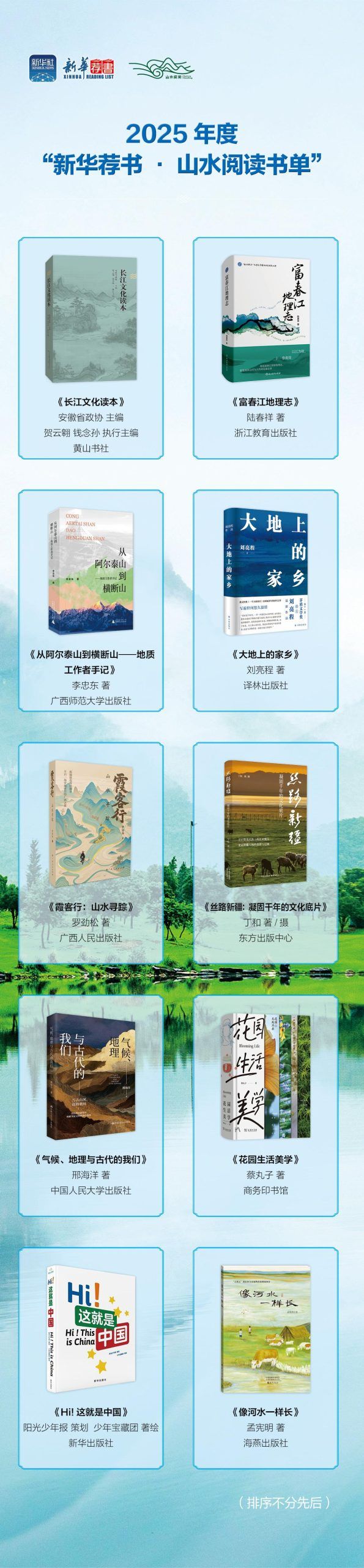 在此次活动上,正式发布了2025年度“新华荐书·山水阅读书单”,《长江文化读本》(黄山书社)、《富春江地理志》(浙江教育出版社)、《从阿尔泰山到横断山——地质工作者手记》(广西师范大学出版社)、《大地上的家乡》(译林出版社)、《霞客行:山水寻踪》(广西人民出版社)、《丝路新疆:凝固千年的文化底片》(东方出版中心)、《气候、地理与古代的我们》(中国人民大学出版社)、《像河水一样长》(海燕出版社)、《Hi!这就是中国》(新华出版社)、《花园生活美学》(商务印书馆)(排序不分先后)入选。10本入选图书出版单位代表现场以器乐、朗诵、豫剧等形式生动展现了图书主题。