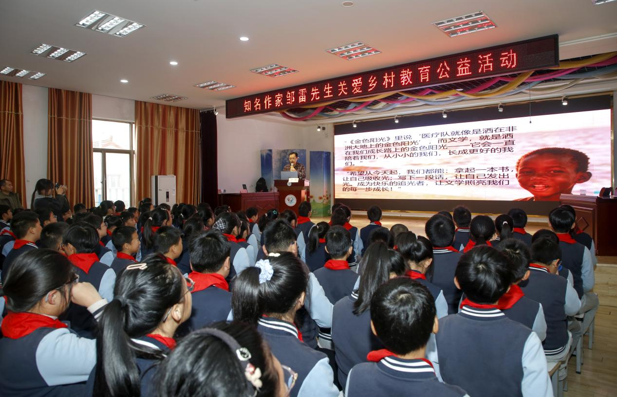 洋口小学地处海边的乡村,留守儿童数量较多,部分学生来自单亲家庭。近年来,孩子们的心理健康问题日益凸显,如何正确引导孩子们的成长,不仅是学校和家长关心的问题,也成为邹雷本次文学讲座的核心方向。2025年11月21日,他如期来到了洋口小学报告厅,为师生带来题为“文学如光照见成长——从《金色阳光》中读懂如何成长”的专题讲座。