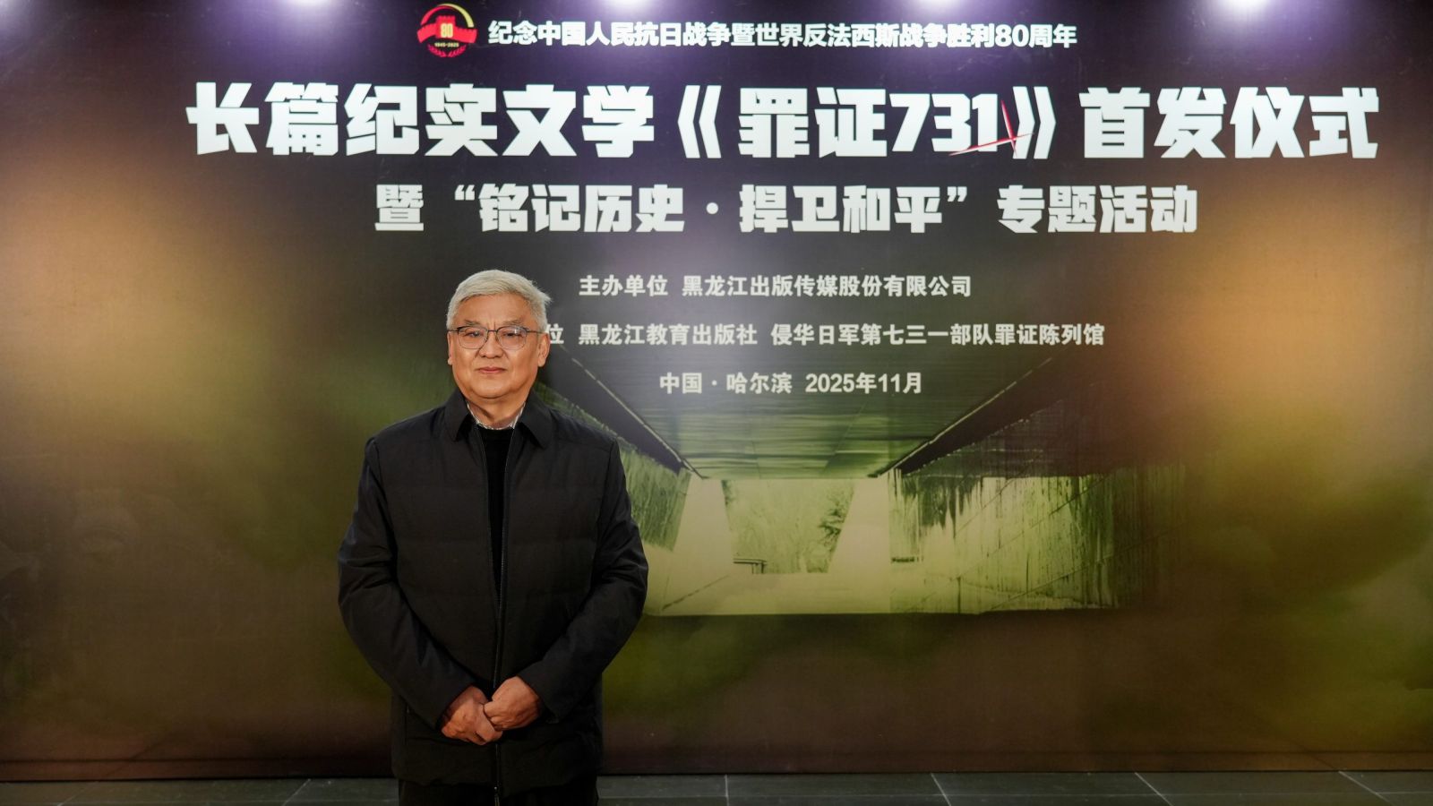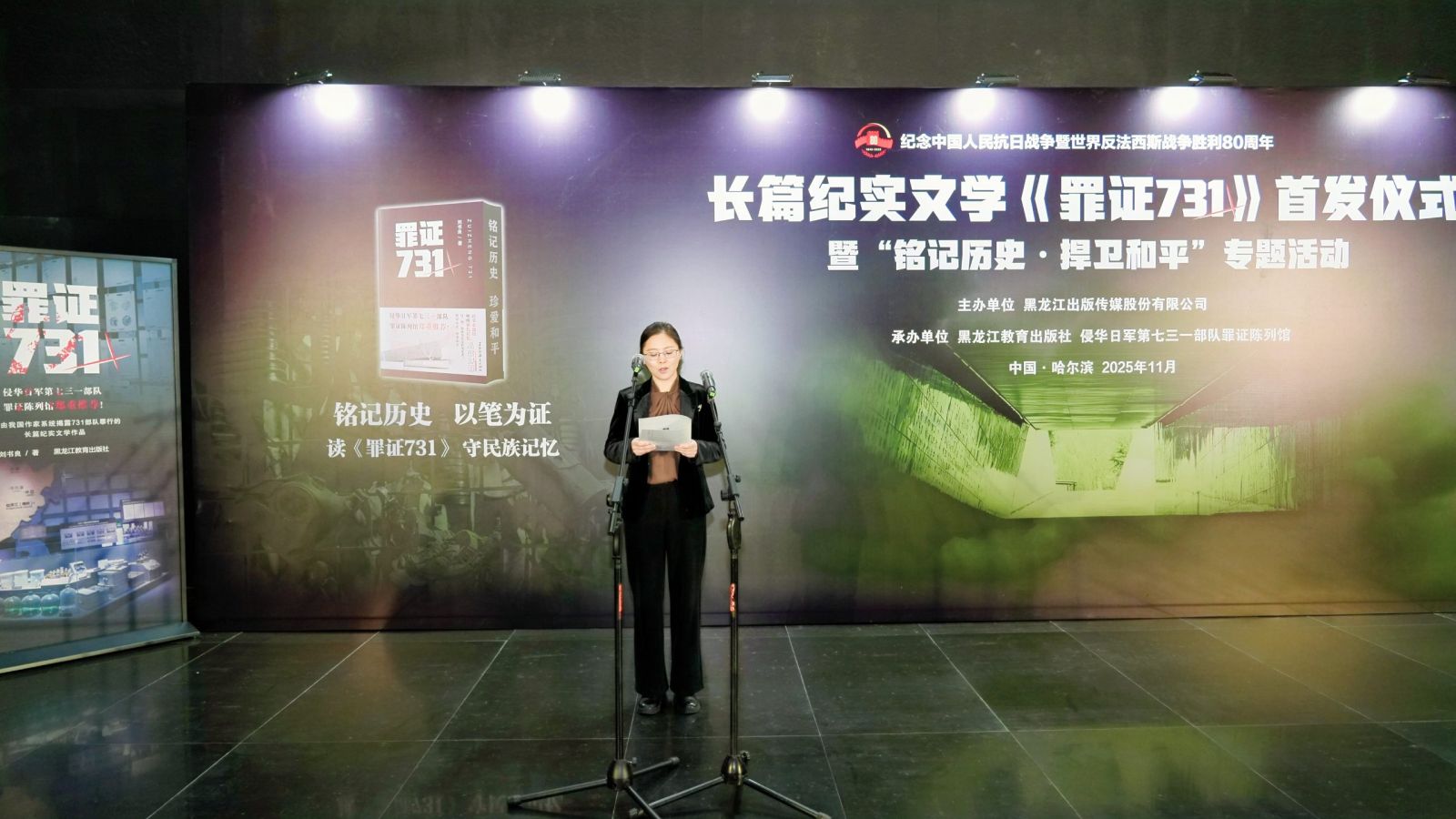 2025年11月28日,长篇纪实文学《罪证731》首发仪式暨“铭记历史·捍卫和平”专题活动在哈尔滨侵华日军第七三一部队罪证陈列馆举办。本次活动由黑龙江出版传媒股份有限公司主办,黑龙江教育出版社、侵华日军第七三一部队罪证陈列馆共同承办。