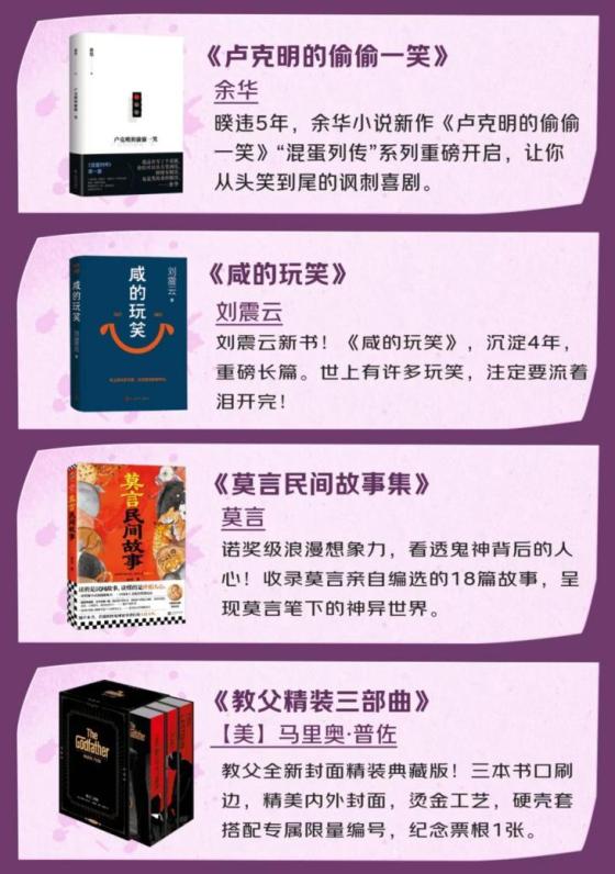 如果你期待沉浸于深刻的文学世界,本月新书绝对值得邂逅。余华暌违五年,以小说新作《卢克明的偷偷一笑》开启全新的“混蛋列传”系列,以其标志性的辛辣笔触打造了一部让人从头笑到尾的讽刺喜剧。刘震云沉淀四年推出的长篇新作《咸的玩笑》,则带来一份深沉思考——“世上有许多玩笑,注定要流着泪开完”。诺贝尔文学奖得主莫言的《莫言民间故事集》,收录18篇充满民间智慧与神异想象的故事,呈现其笔下的神异世界与人性洞察。文学与影史经典《教父》也迎来华丽升级——《教父精装三部曲》全新典藏版,三面刷边搭配烫金工艺,同时配有限量编号和纪念票根,为文学收藏爱好者带来惊喜。