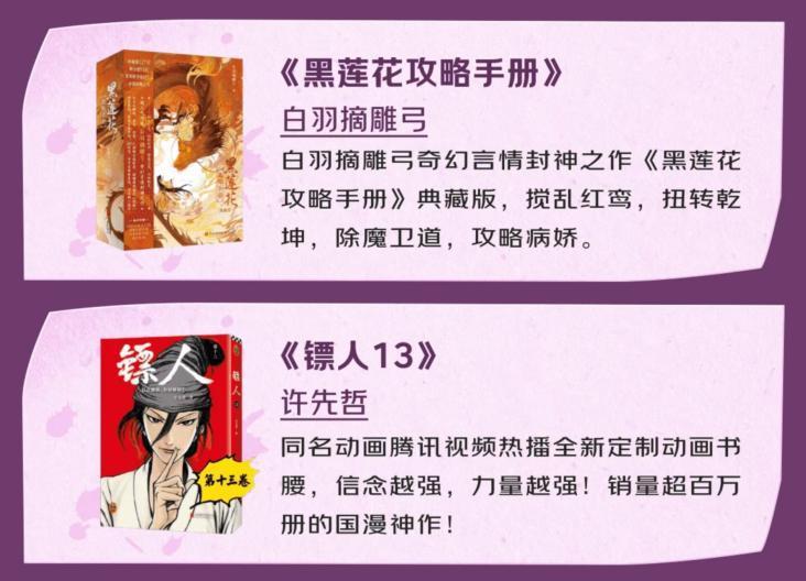 在满足认知提升需求之外,轻松有趣类型的读物也是不少读者的心头好。白羽摘雕弓的奇幻言情封神之作《黑莲花攻略手册》推出典藏版,以“攻略病娇”的主线、情节跌宕起伏的故事设定,始终占据年轻女性读者的收藏书单。国漫爱好者也有新惊喜,销量突破百万册的国漫口碑之作《镖人13》全新上市,随书附赠全新定制动画书腰,贯穿始终的“信念越强,力量越强”的热血精神,无论是老粉追更收藏还是新粉入坑都十分合适。