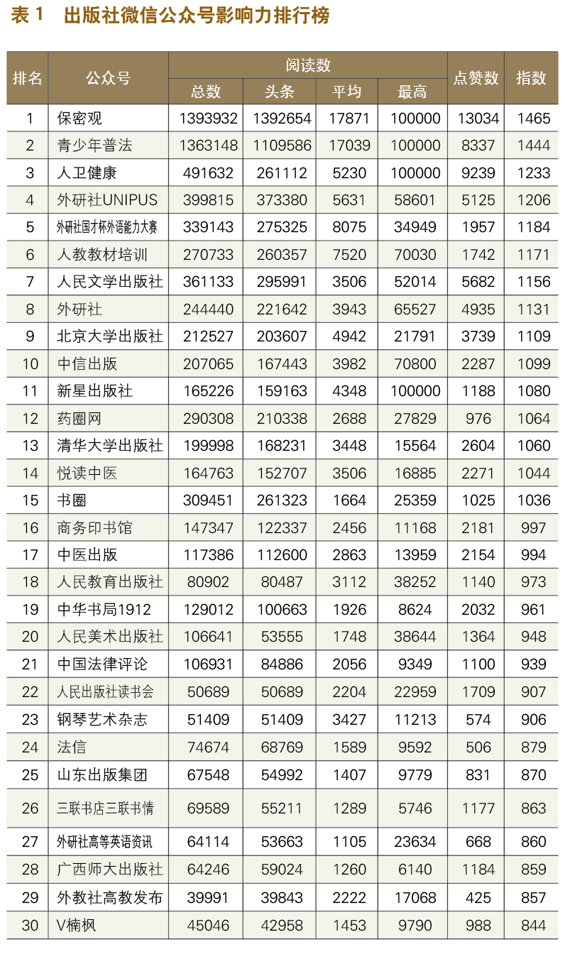 从出版社微信公众号指数情况来看,本期前三名分别为“保密观”“青少年普法”和“人卫健康”。“保密观”本期位列第一,在统计周期内共发布78篇文章,总阅读量近140万次,相比上期增加近30万次,平均阅读量近1.8万次。“青少年普法”本期排名第二,在统计周期内发文80篇,总阅读量超136万次,平均阅读量近1.8万次。“人卫健康”本期排名第三,在统计周期内发文94篇,总阅读量近50万次。