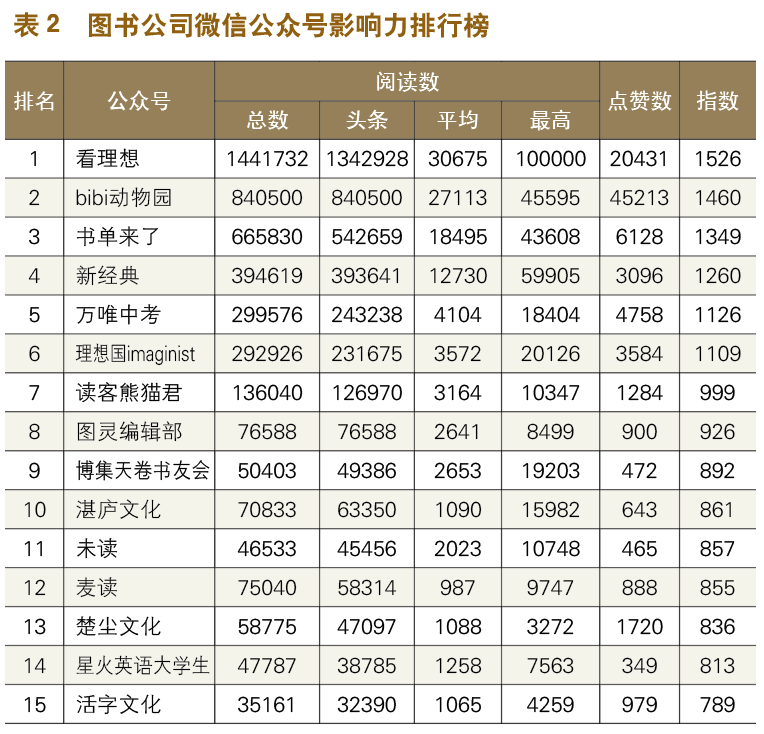 图书公司微信公众号影响力排名前三的分别是“看理想”“bibi动物园”和“书单来了”。“看理想”本期共发布47篇文章,统计期内总阅读量超144万次,相比上期增加22万次,平均阅读量超3万次,《“有份工作你就感恩戴德吧”》《我们把历史想得太大,把个人想得太小》等4篇文章阅读量超10万次。排名第二的“bibi动物园”,在统计周期内共计发布31篇文章,总阅读量超84万次,平均阅读量为2.7万次。第三名“书单来了”在统计周期内共发布36篇文章,总阅读量超66万次,平均阅读量达1.8万次。