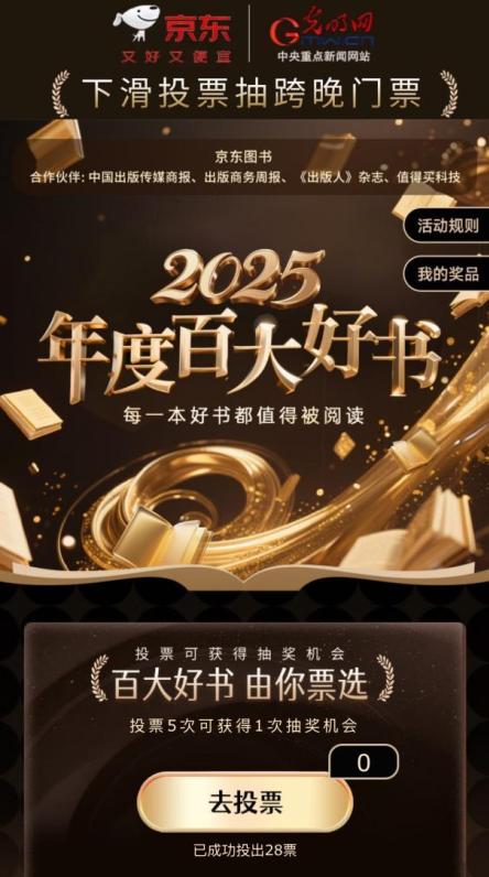 京东图书与光明网联合发起的“2025年度百大好书”全民票选活动,将于12月23日迎来文学小说品类日。本品类专场聚焦叙事的力量与想象的疆域,汇集年度热门新作、经典纪念版本与多元类型小说,邀请广大读者为那些真正触动心灵、激发思考的文学作品投票。即日起,打开京东APP搜索“百大好书”,即可参与票选,您的一票将直接助力心仪之作入选年度好书榜单。参与投票有机会获得湖南卫视跨年演唱会门票、周边IP等专属好礼,还可组队瓜分百万京豆,让阅读的选择更具回响。