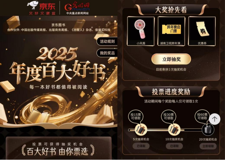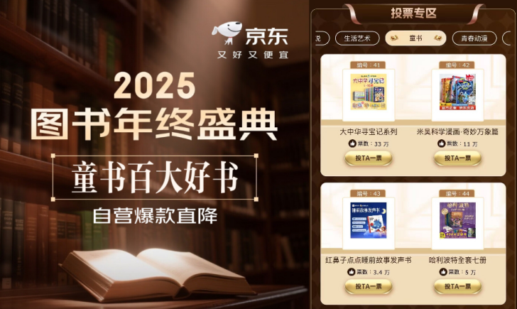 阅读是孩子成长路上的珍贵礼物,发现好书的过程更藏着别样乐趣。日前,京东图书与光明网联合发起的 “2025年度百大好书”全民票选已进行至关键阶段,12月25日票选活动将推出童书品类日,诚邀家长与小朋友们一同打开京东APP搜索 “百大好书”,为心仪的童书佳作投上一票,让优质儿童读物得到更多家庭关注。参与投票即有机会抽取购书优惠券、作者签名书及限定周边等福利,更有机会抽取湖南卫视跨年演唱会门票,为亲子时光增添惊喜。