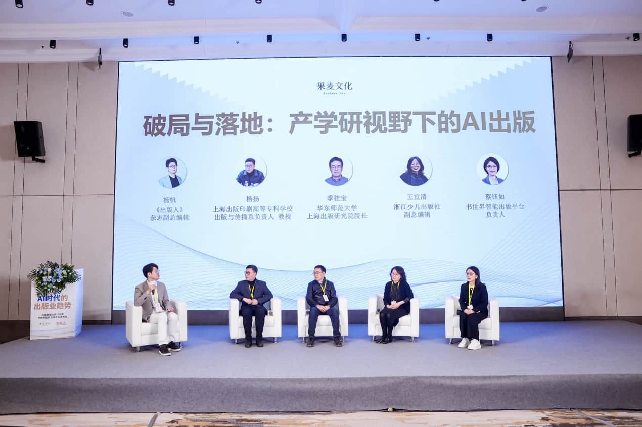 来自全国各大出版集团的领导、出版社社长、总编辑、业务负责人,以及产学研领域的专家学者齐聚一堂,共同探讨AI时代出版业的变革路径,并见证由果麦文化自研、专为出版机构打造的AI工作平台——“书世界智能出版平台”的发布。会议最后,主办方邀请了产学研三方代表,共同讨论AI出版的破局与落地。