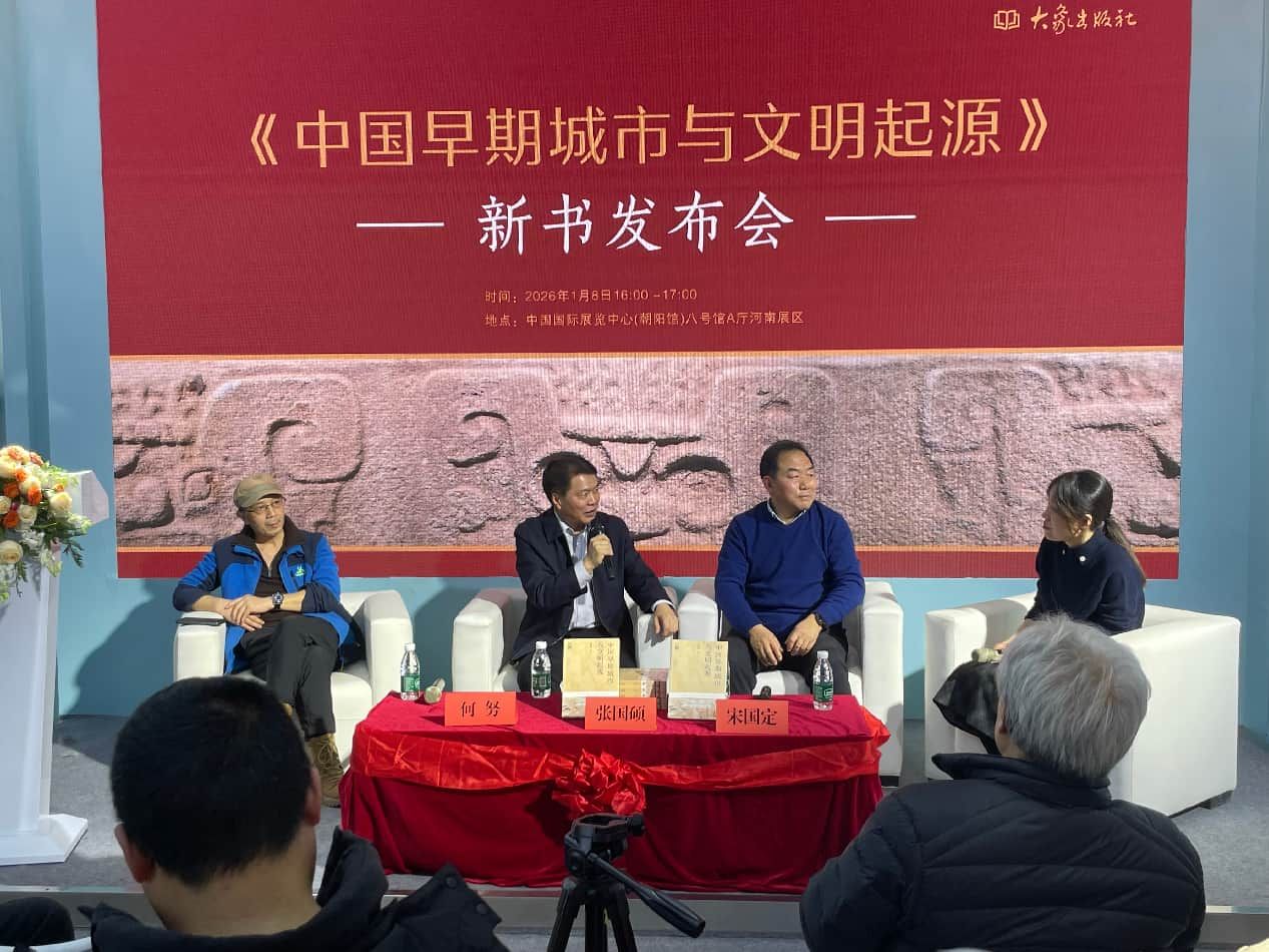2026年北京图书订货会期间,由大象出版社精心策划的《中国早期城市与文明起源》新书发布会1月8日在河南展区举行。郑州大学考古与文化遗产学院教授张国硕、中国社会科学院考古研究所研究员何努、北京联合大学应用文理学院教授宋国定三位考古学家齐聚现场,共同开启一场关于中国早期城市与文明起源的深度对话。