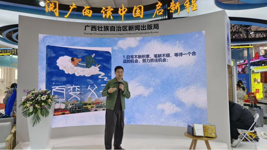 1月10日上午,中国国际展览中心(朝阳馆)广西展台迎来一场温馨的亲子聚会——由广西教育出版社主办的“新年绘爱:《百变父子》新书分享会”在此如期举行。活动融合图画书分享、亲子对话与年俗体验,在书香与墨香中,开启了一段关于陪伴、成长与爱的冬日暖叙。