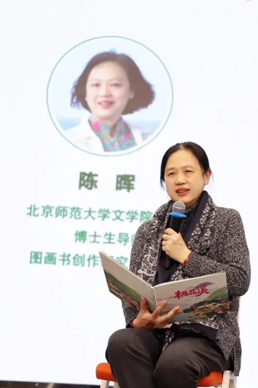 北京师范大学文学院教授、博士生导师,图画书创作研究中心主任陈晖结合作品内容与儿童认知特点,为孩子们带来深度解读。牛在乡村中是农民耕田的重要帮手,不仅承载着祖祖辈辈的农耕文化,书中牛与小朋友的亲密互动、特色斗牛场景,更让作品蕴含了厚重的传统农耕文明内涵,呼应了作者“牛很宝贵”的表述。她还建议孩子们在阅读《桃花溪》时要关注细节,体会文字与图画中蕴含的美,通过这种方式提升阅读能力。书中乡村斗牛风俗,是中国多样民俗的缩影,她鼓励孩子们多和家人、老师、同学了解各地风俗,从中领略不同民族不同地区各具特色的风情,深刻理解作品背后的文化价值。